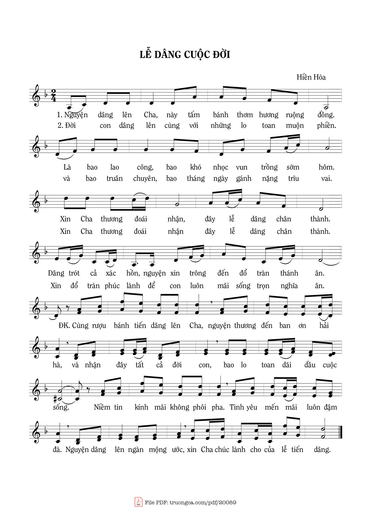 Sheet music Lễ dâng cuộc đời by Hiền Hòa and PDF file was posted here to support you to practice singing perfectly. Sheets with notes and chords are for reference only, for non-commercial purposes only, not involved with earning money by buying and selling. Copyright is belong to song writer/author and copyright owner. Truongca.com do not own any copyrighted content. You can download the high-quality PDF files which contain staffs by PDF link above.
