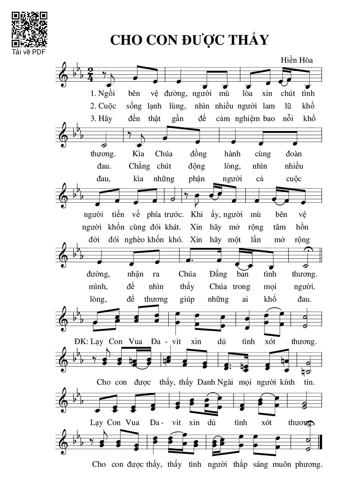 Sheet music Cho con được thấy by Hiền Hòa and PDF file was posted here to support you to practice singing perfectly. Sheets with notes and chords are for reference only, for non-commercial purposes only, not involved with earning money by buying and selling. Copyright is belong to song writer/author and copyright owner. Truongca.com do not own any copyrighted content. You can download the high-quality PDF files which contain staffs by PDF link above.