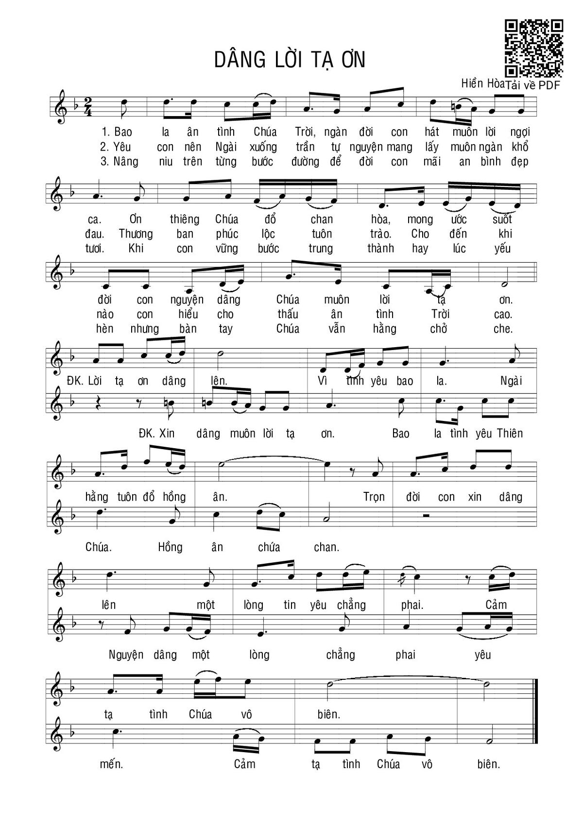 Sheet music Dâng lời tạ ơn by Hiền Hòa and PDF file was posted here to support you to practice singing perfectly. Sheets with notes and chords are for reference only, for non-commercial purposes only, not involved with earning money by buying and selling. Copyright is belong to song writer/author and copyright owner. Truongca.com do not own any copyrighted content. You can download the high-quality PDF files which contain staffs by PDF link above.