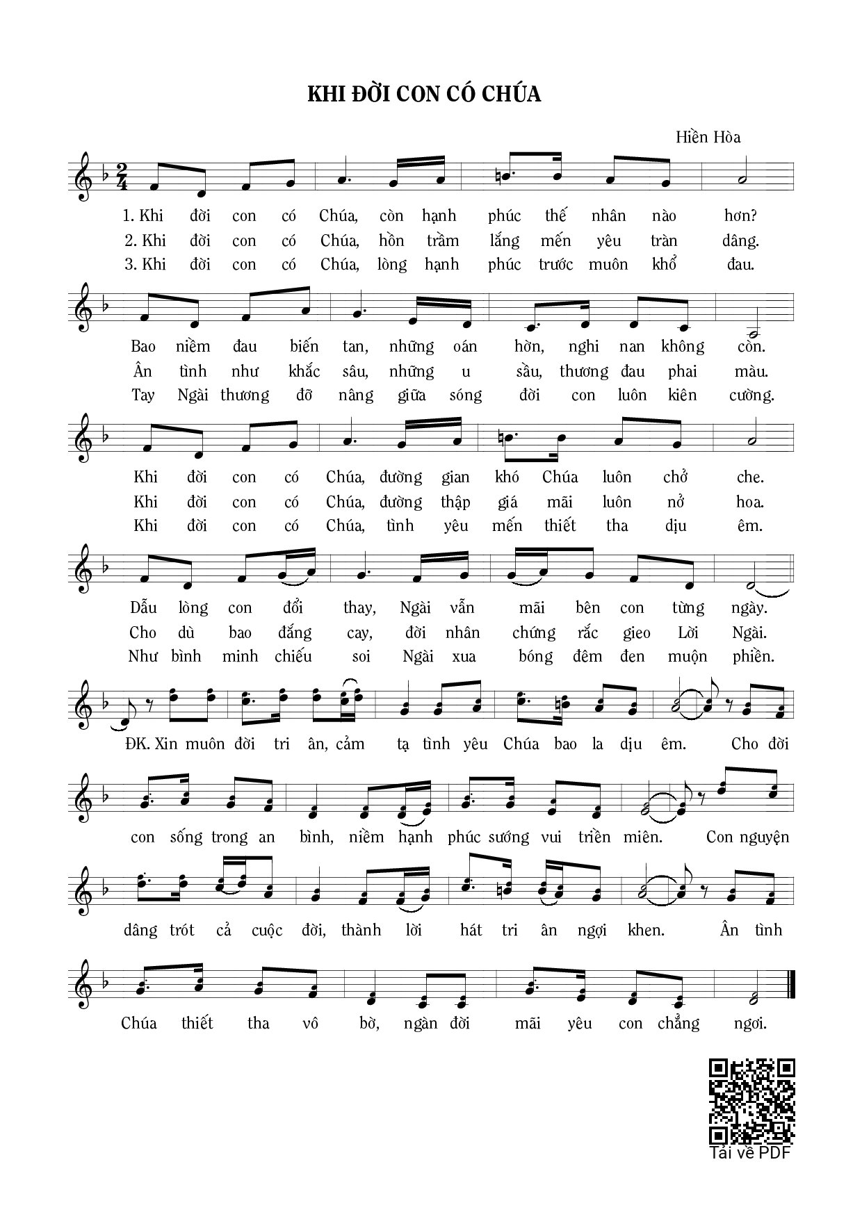 Sheet music Khi đời con có Chúa by Hiền Hòa and PDF file was posted here to support you to practice singing perfectly. Sheets with notes and chords are for reference only, for non-commercial purposes only, not involved with earning money by buying and selling. Copyright is belong to song writer/author and copyright owner. Truongca.com do not own any copyrighted content. You can download the high-quality PDF files which contain staffs by PDF link above.