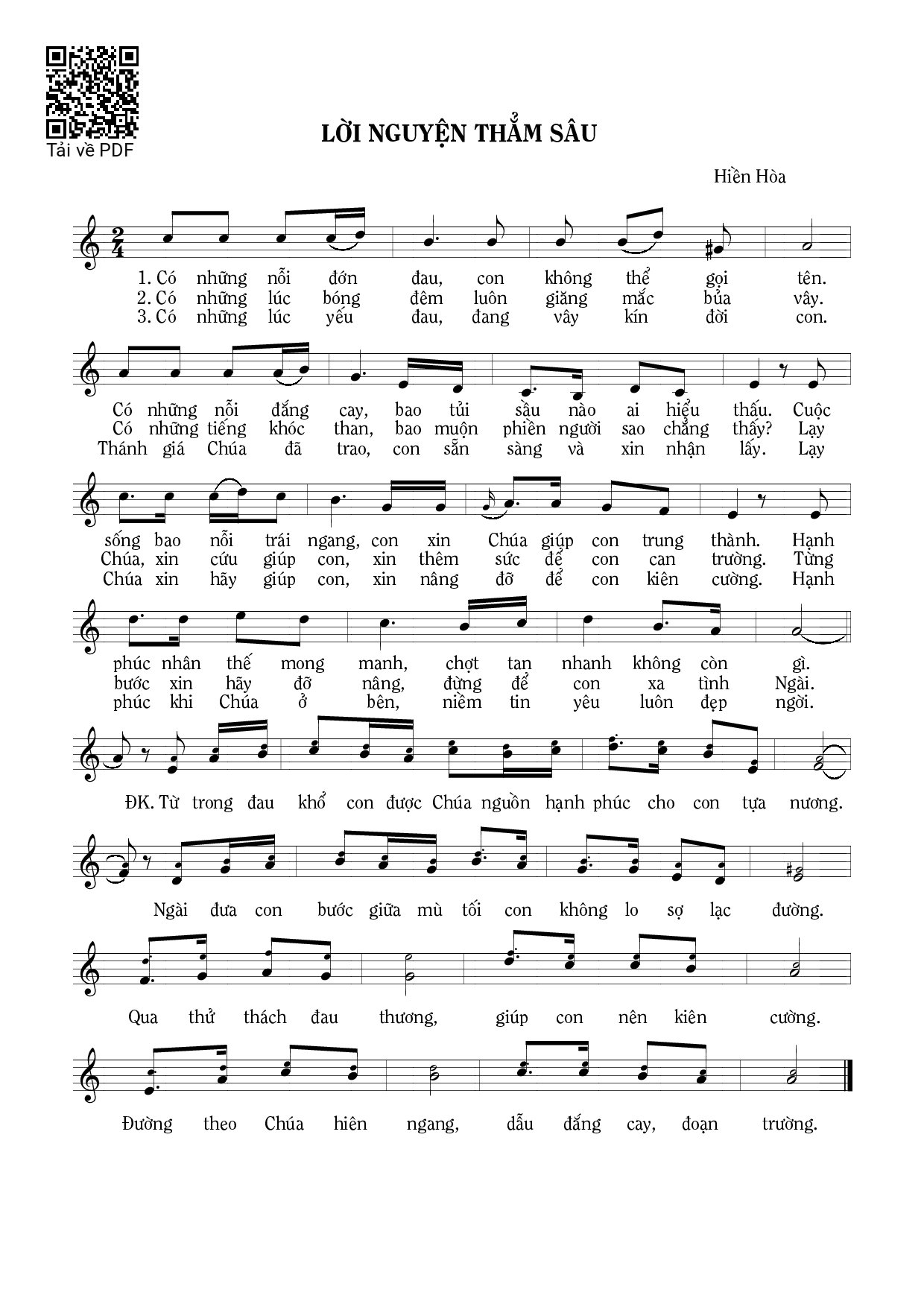 Sheet music Lời nguyện thẳm sâu by Hiền Hòa and PDF file was posted here to support you to practice singing perfectly. Sheets with notes and chords are for reference only, for non-commercial purposes only, not involved with earning money by buying and selling. Copyright is belong to song writer/author and copyright owner. Truongca.com do not own any copyrighted content. You can download the high-quality PDF files which contain staffs by PDF link above.