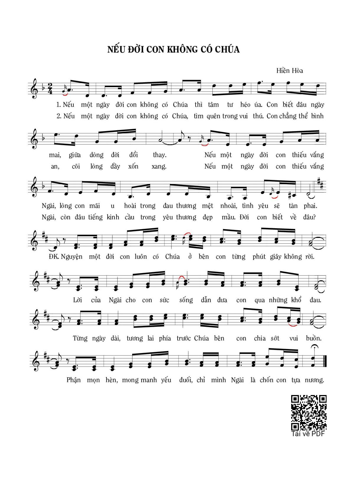 Sheet music Nếu đời không có Chúa by Hiền Hòa and PDF file was posted here to support you to practice singing perfectly. Sheets with notes and chords are for reference only, for non-commercial purposes only, not involved with earning money by buying and selling. Copyright is belong to song writer/author and copyright owner. Truongca.com do not own any copyrighted content. You can download the high-quality PDF files which contain staffs by PDF link above.