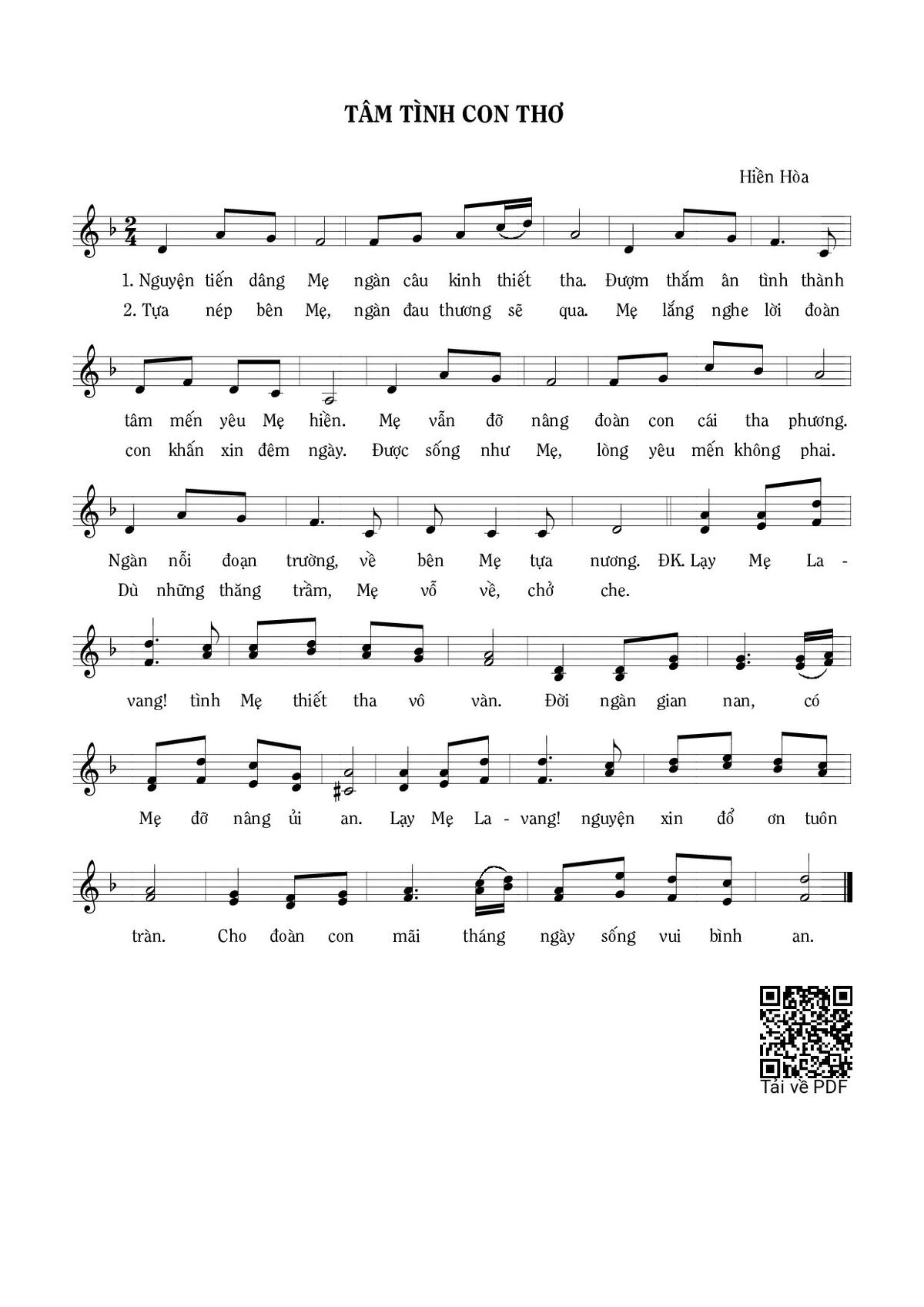 Sheet music Tâm tình con thơ by Hiền Hòa and PDF file was posted here to support you to practice singing perfectly. Sheets with notes and chords are for reference only, for non-commercial purposes only, not involved with earning money by buying and selling. Copyright is belong to song writer/author and copyright owner. Truongca.com do not own any copyrighted content. You can download the high-quality PDF files which contain staffs by PDF link above.