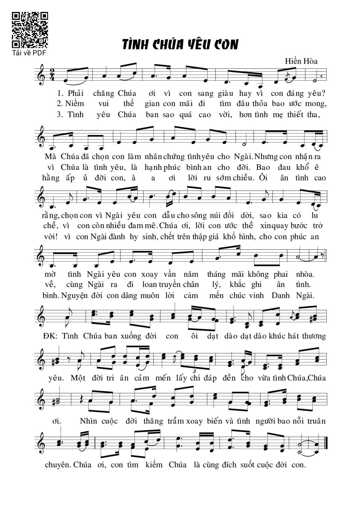 Sheet music Tình Chúa yêu con 1 by Hiền Hòa and PDF file was posted here to support you to practice singing perfectly. Sheets with notes and chords are for reference only, for non-commercial purposes only, not involved with earning money by buying and selling. Copyright is belong to song writer/author and copyright owner. Truongca.com do not own any copyrighted content. You can download the high-quality PDF files which contain staffs by PDF link above.
