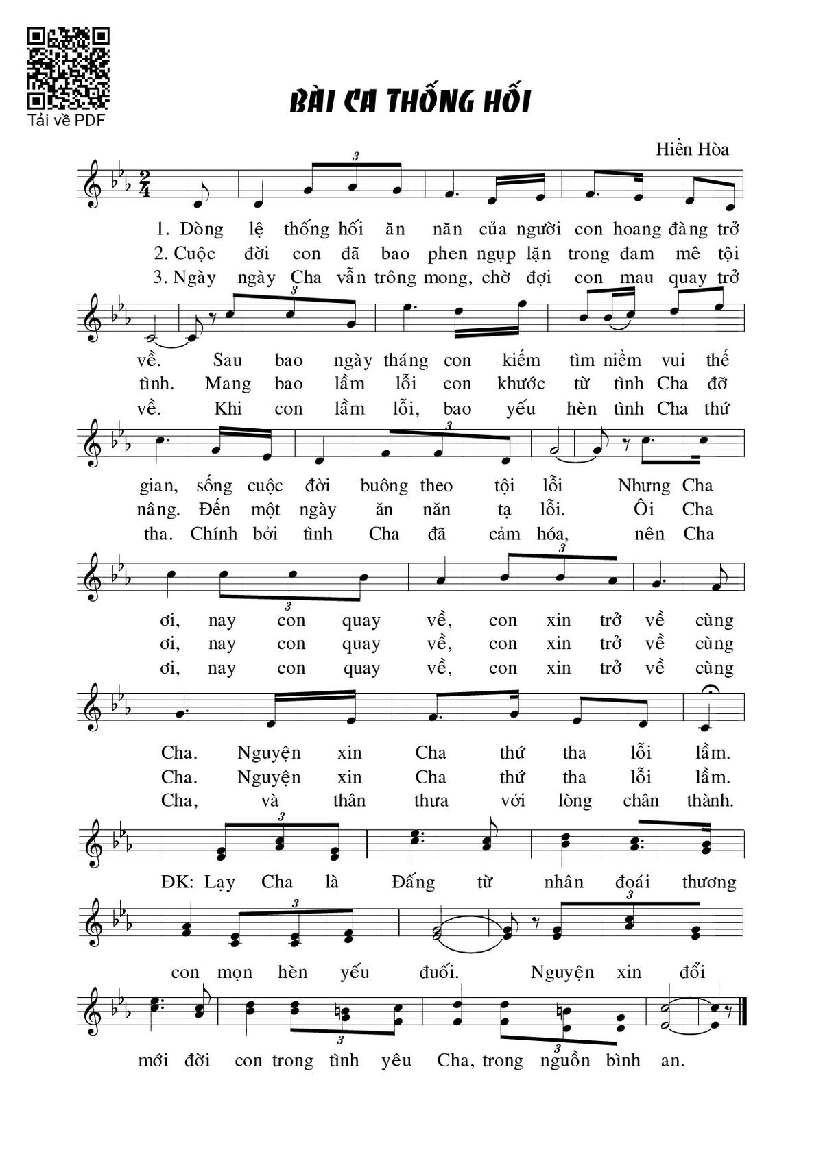 Sheet music Bài ca thống hối (Lc. 15) by Hiền Hòa and PDF file was posted here to support you to practice singing perfectly. Sheets with notes and chords are for reference only, for non-commercial purposes only, not involved with earning money by buying and selling. Copyright is belong to song writer/author and copyright owner. Truongca.com do not own any copyrighted content. You can download the high-quality PDF files which contain staffs by PDF link above.