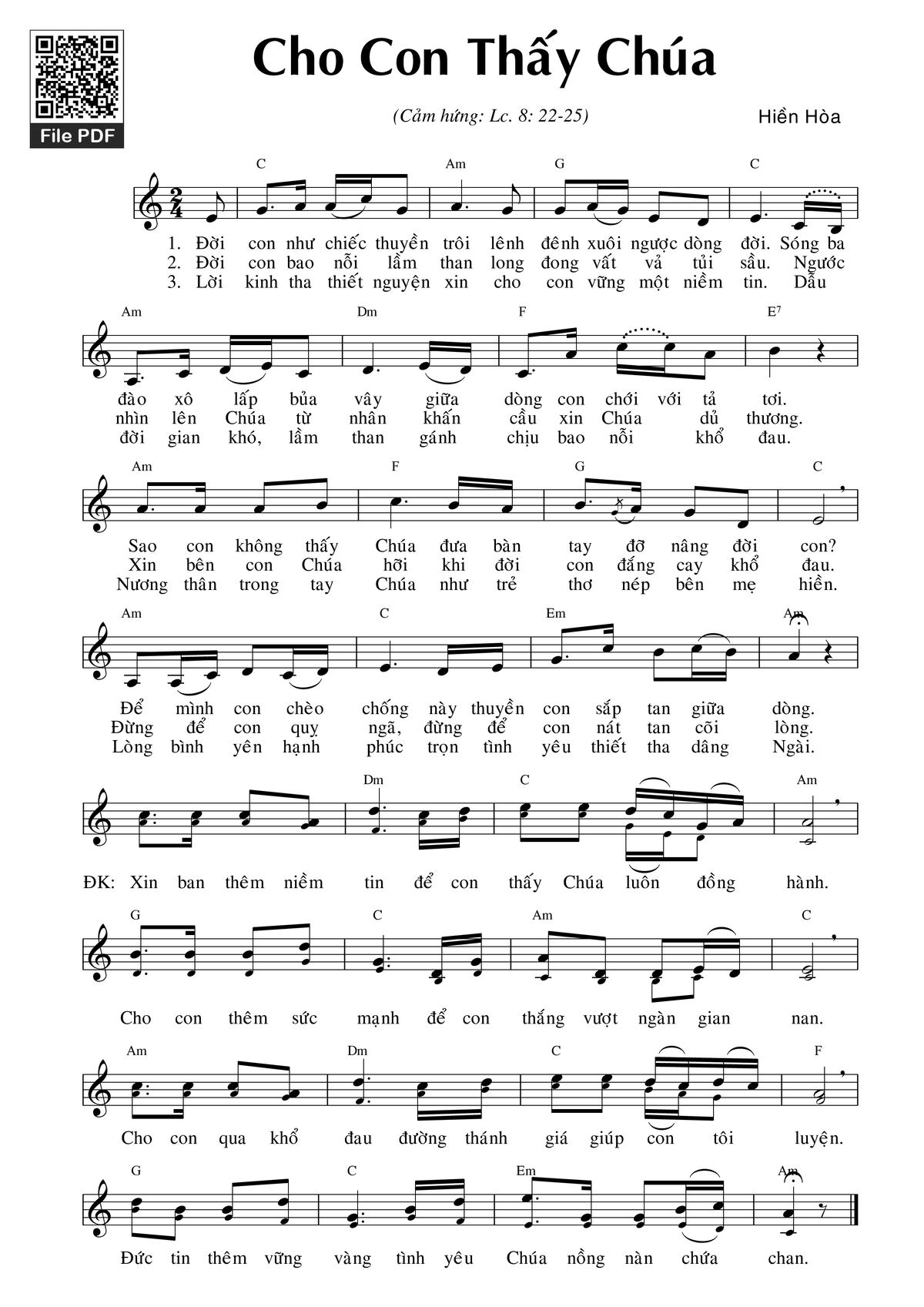 Sheet music Cho con thấy Chúa (Lc. 8) by Hiền Hòa and PDF file was posted here to support you to practice singing perfectly. Sheets with notes and chords are for reference only, for non-commercial purposes only, not involved with earning money by buying and selling. Copyright is belong to song writer/author and copyright owner. Truongca.com do not own any copyrighted content. You can download the high-quality PDF files which contain staffs by PDF link above.