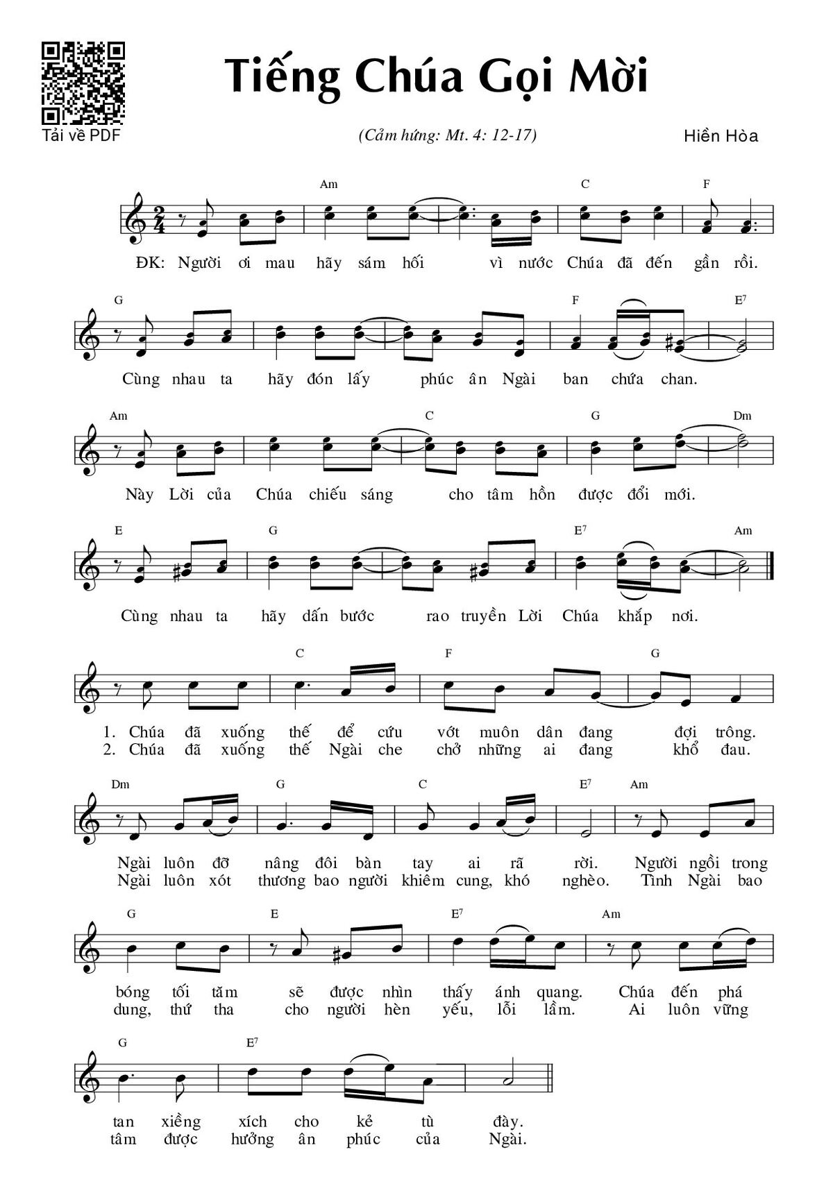 Sheet music Tiếng Chúa gọi mời (Mt. 4) by Hiền Hòa and PDF file was posted here to support you to practice singing perfectly. Sheets with notes and chords are for reference only, for non-commercial purposes only, not involved with earning money by buying and selling. Copyright is belong to song writer/author and copyright owner. Truongca.com do not own any copyrighted content. You can download the high-quality PDF files which contain staffs by PDF link above.