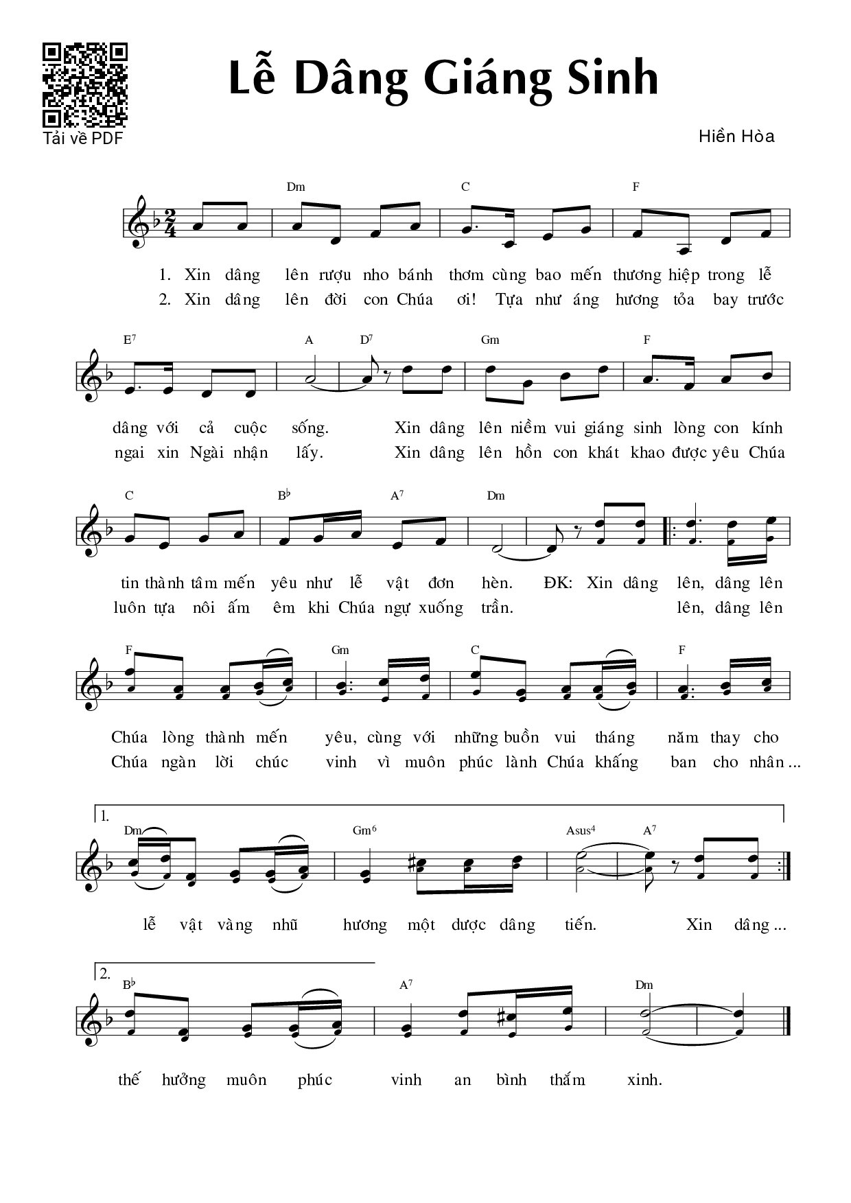 Sheet music Lễ dâng Giáng Sinh by Hiền Hòa and PDF file was posted here to support you to practice singing perfectly. Sheets with notes and chords are for reference only, for non-commercial purposes only, not involved with earning money by buying and selling. Copyright is belong to song writer/author and copyright owner. Truongca.com do not own any copyrighted content. You can download the high-quality PDF files which contain staffs by PDF link above.