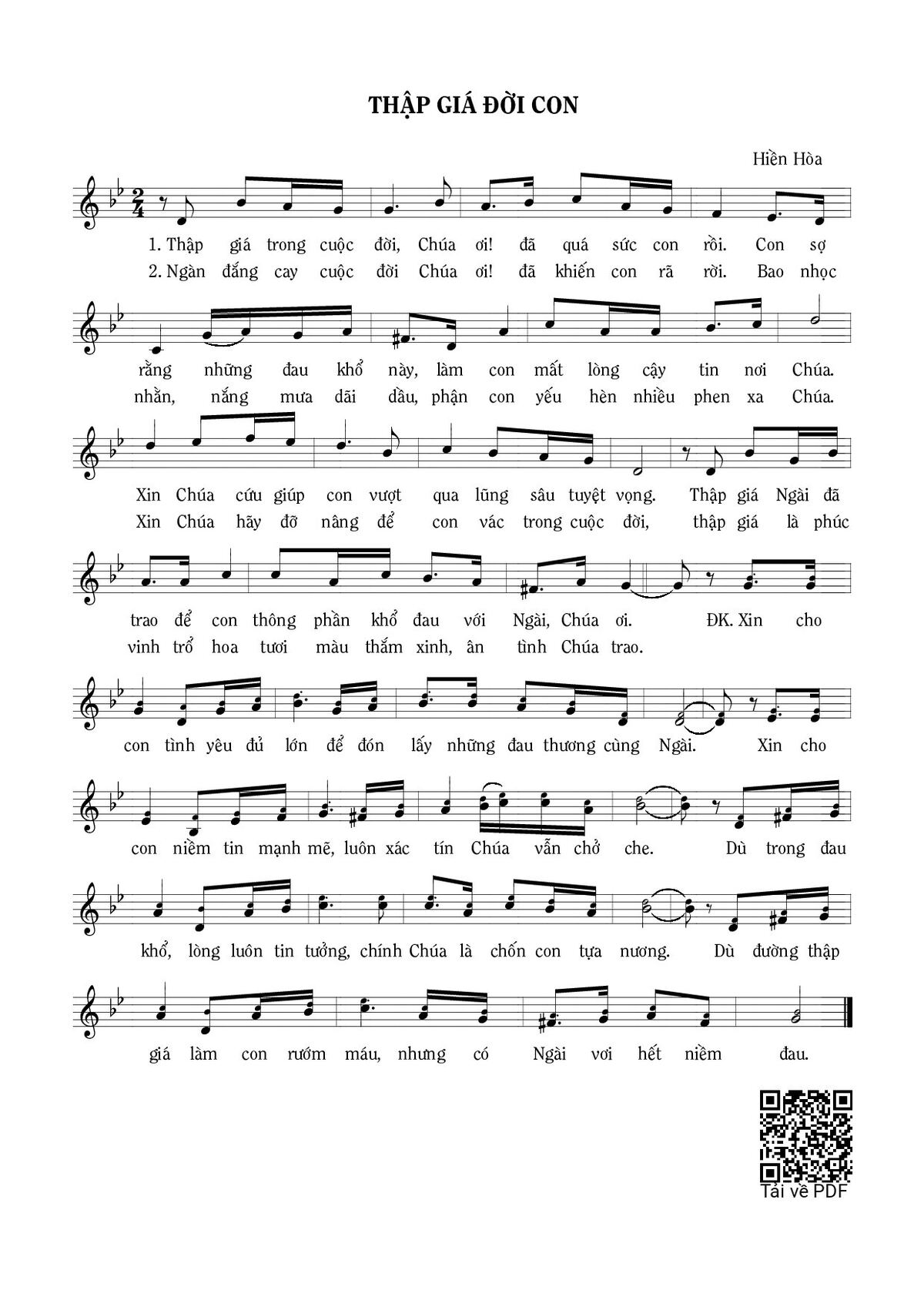 Sheet music Thập giá đời con by Hiền Hòa and PDF file was posted here to support you to practice singing perfectly. Sheets with notes and chords are for reference only, for non-commercial purposes only, not involved with earning money by buying and selling. Copyright is belong to song writer/author and copyright owner. Truongca.com do not own any copyrighted content. You can download the high-quality PDF files which contain staffs by PDF link above.