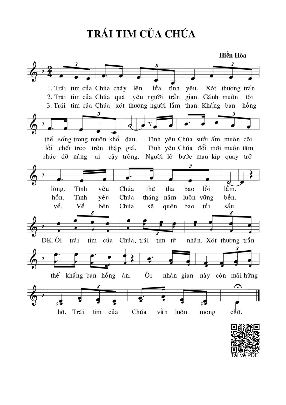 Sheet music Trái tim của Chúa by Hiền Hòa and PDF file was posted here to support you to practice singing perfectly. Sheets with notes and chords are for reference only, for non-commercial purposes only, not involved with earning money by buying and selling. Copyright is belong to song writer/author and copyright owner. Truongca.com do not own any copyrighted content. You can download the high-quality PDF files which contain staffs by PDF link above.
