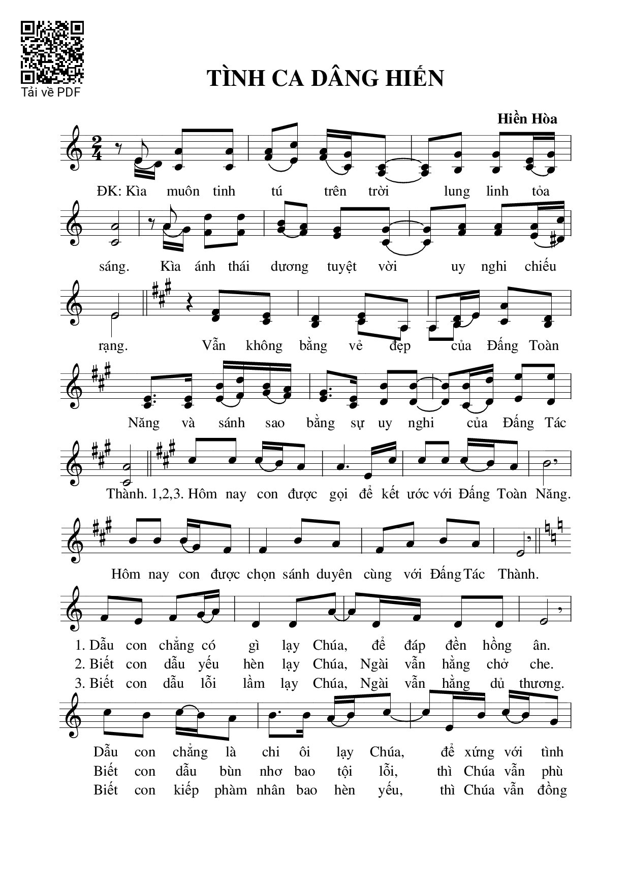 Sheet music Tình ca dâng hiến by Hiền Hòa and PDF file was posted here to support you to practice singing perfectly. Sheets with notes and chords are for reference only, for non-commercial purposes only, not involved with earning money by buying and selling. Copyright is belong to song writer/author and copyright owner. Truongca.com do not own any copyrighted content. You can download the high-quality PDF files which contain staffs by PDF link above.