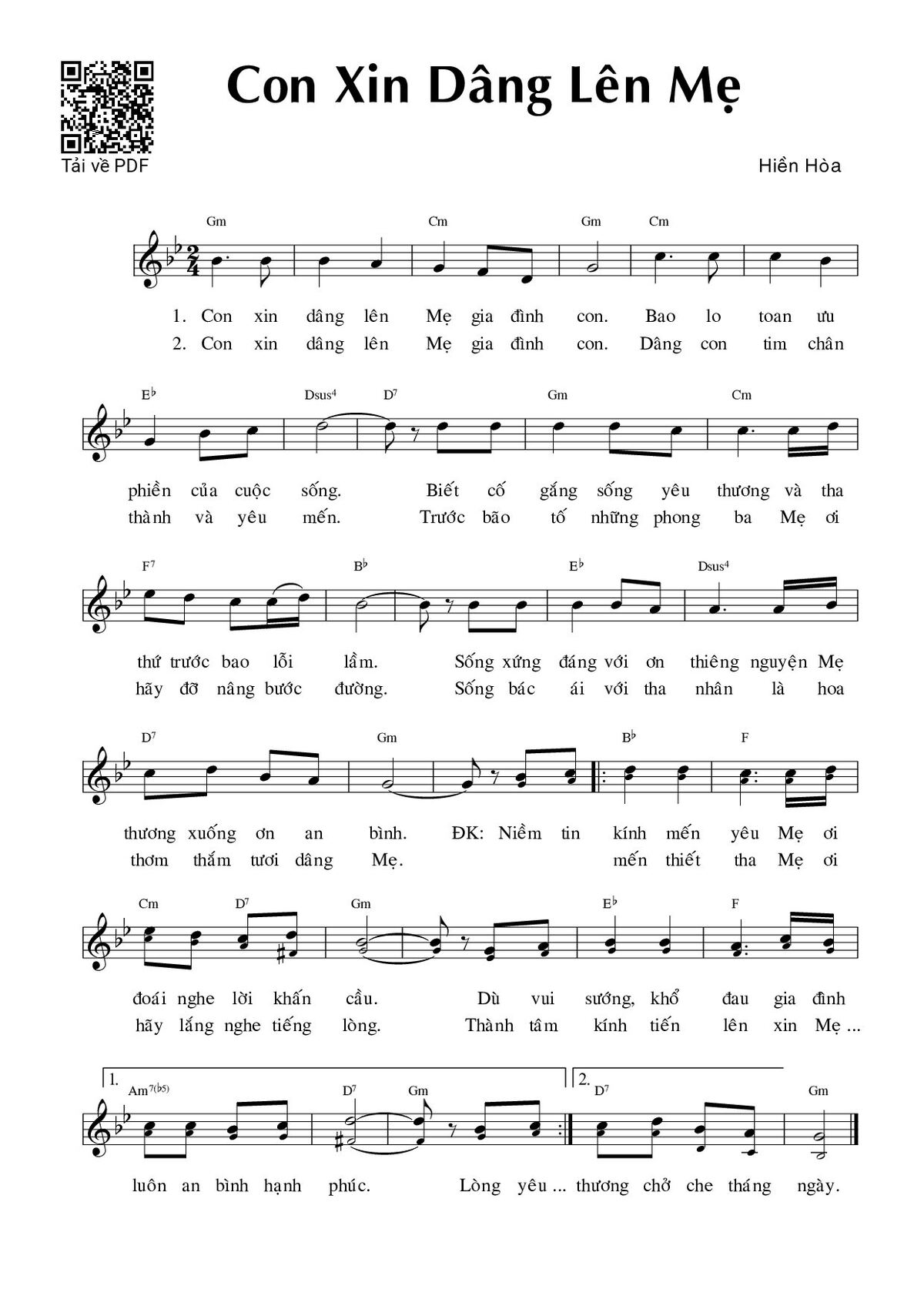 Sheet music Con xin dâng lên Mẹ by Hiền Hòa and PDF file was posted here to support you to practice singing perfectly. Sheets with notes and chords are for reference only, for non-commercial purposes only, not involved with earning money by buying and selling. Copyright is belong to song writer/author and copyright owner. Truongca.com do not own any copyrighted content. You can download the high-quality PDF files which contain staffs by PDF link above.