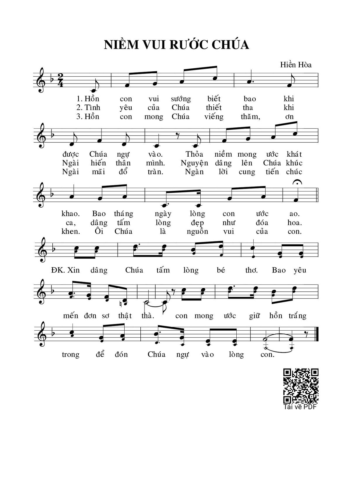 Sheet music Niềm vui rước Chúa by Hiền Hòa and PDF file was posted here to support you to practice singing perfectly. Sheets with notes and chords are for reference only, for non-commercial purposes only, not involved with earning money by buying and selling. Copyright is belong to song writer/author and copyright owner. Truongca.com do not own any copyrighted content. You can download the high-quality PDF files which contain staffs by PDF link above.