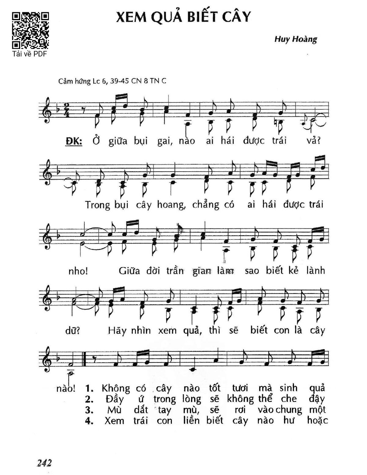 Điệp khúc. Ở giữa bụi gai, nào ai hái được trái vả? Trong bụi cây hoang, chẳng có ai hái được trái nho! Giữa đời trần gian làm sao biết kẻ lành dữ? Hãy nhìn xem quả, thì sẽ biết con là cây nào.
