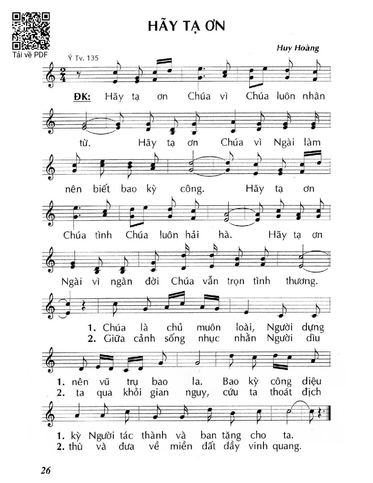 Sheet music Hãy tạ ơn (Thánh Vịnh 135) by Huy Hoàng and PDF file was posted here to support you to practice singing perfectly. Sheets with notes and chords are for reference only, for non-commercial purposes only, not involved with earning money by buying and selling. Copyright is belong to song writer/author and copyright owner. Truongca.com do not own any copyrighted content. You can download the high-quality PDF files which contain staffs by PDF link above.