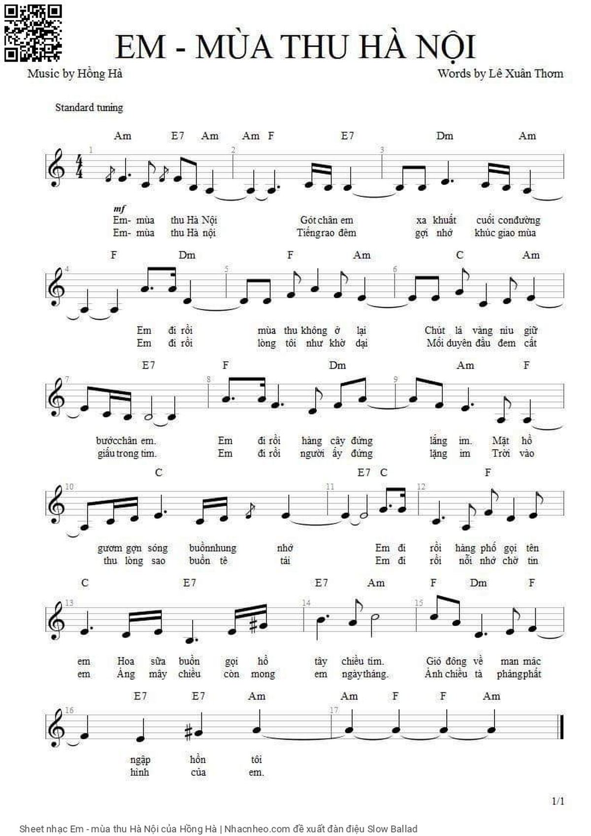 Hồng Hà Em mùa Thu Hà Nội Gót chân em xa khuất cuối con đường [PDF] [Sheet] [Lyrics] [Mp4/Midi]