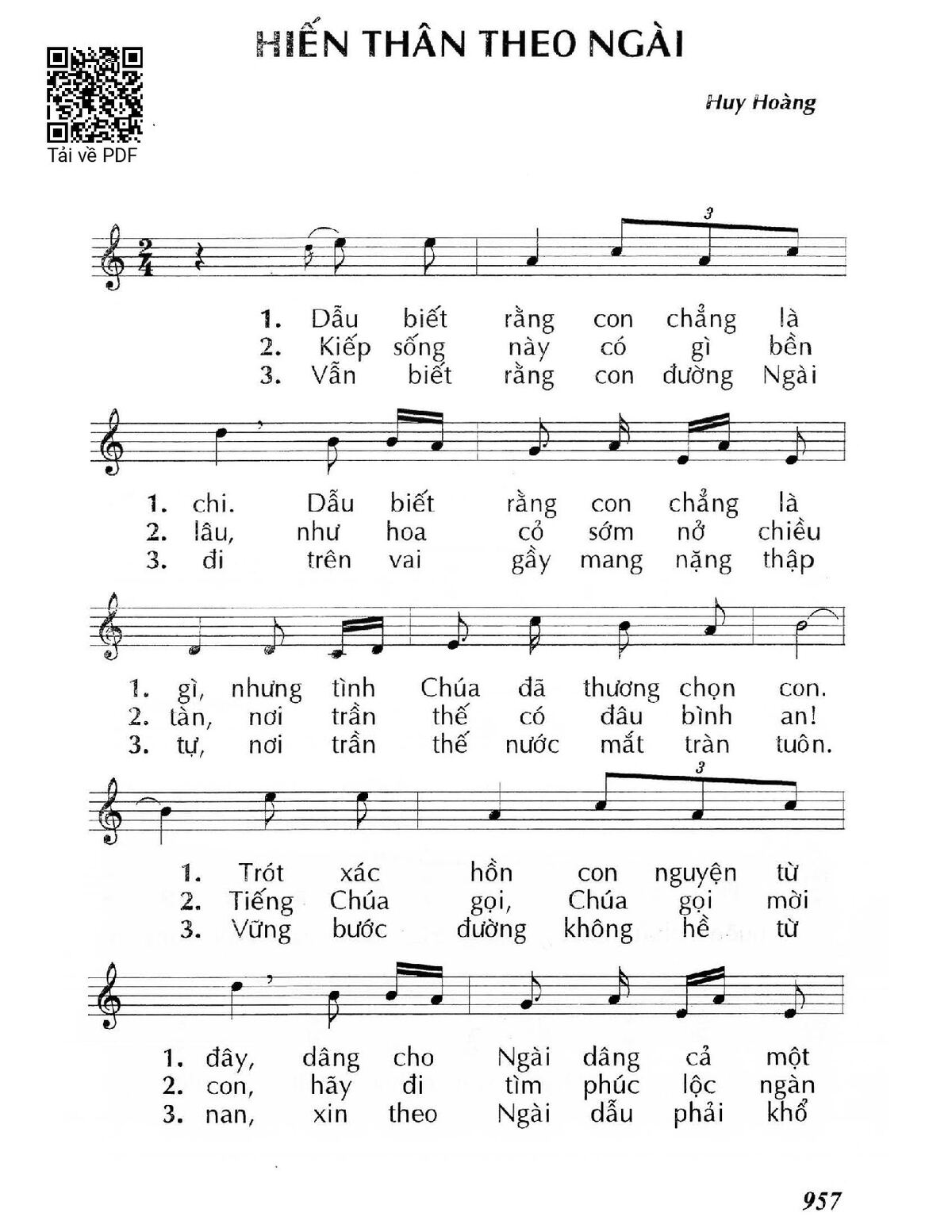 Sheet music Hiến thân theo Ngài by Huy Hoàng and PDF file was posted here to support you to practice singing perfectly. Sheets with notes and chords are for reference only, for non-commercial purposes only, not involved with earning money by buying and selling. Copyright is belong to song writer/author and copyright owner. Truongca.com do not own any copyrighted content. You can download the high-quality PDF files which contain staffs by PDF link above.