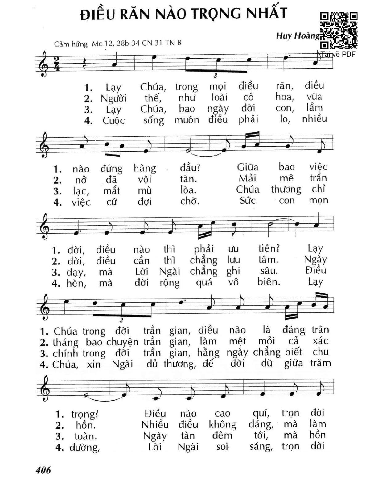 Sheet music Điều răn nào trọng nhất (Mc. 12) by Huy Hoàng and PDF file was posted here to support you to practice singing perfectly. Sheets with notes and chords are for reference only, for non-commercial purposes only, not involved with earning money by buying and selling. Copyright is belong to song writer/author and copyright owner. Truongca.com do not own any copyrighted content. You can download the high-quality PDF files which contain staffs by PDF link above.