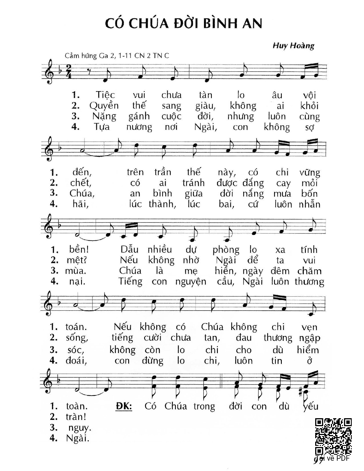 Sheet music Có Chúa đời bình an (Ga. 2) by Huy Hoàng and PDF file was posted here to support you to practice singing perfectly. Sheets with notes and chords are for reference only, for non-commercial purposes only, not involved with earning money by buying and selling. Copyright is belong to song writer/author and copyright owner. Truongca.com do not own any copyrighted content. You can download the high-quality PDF files which contain staffs by PDF link above.