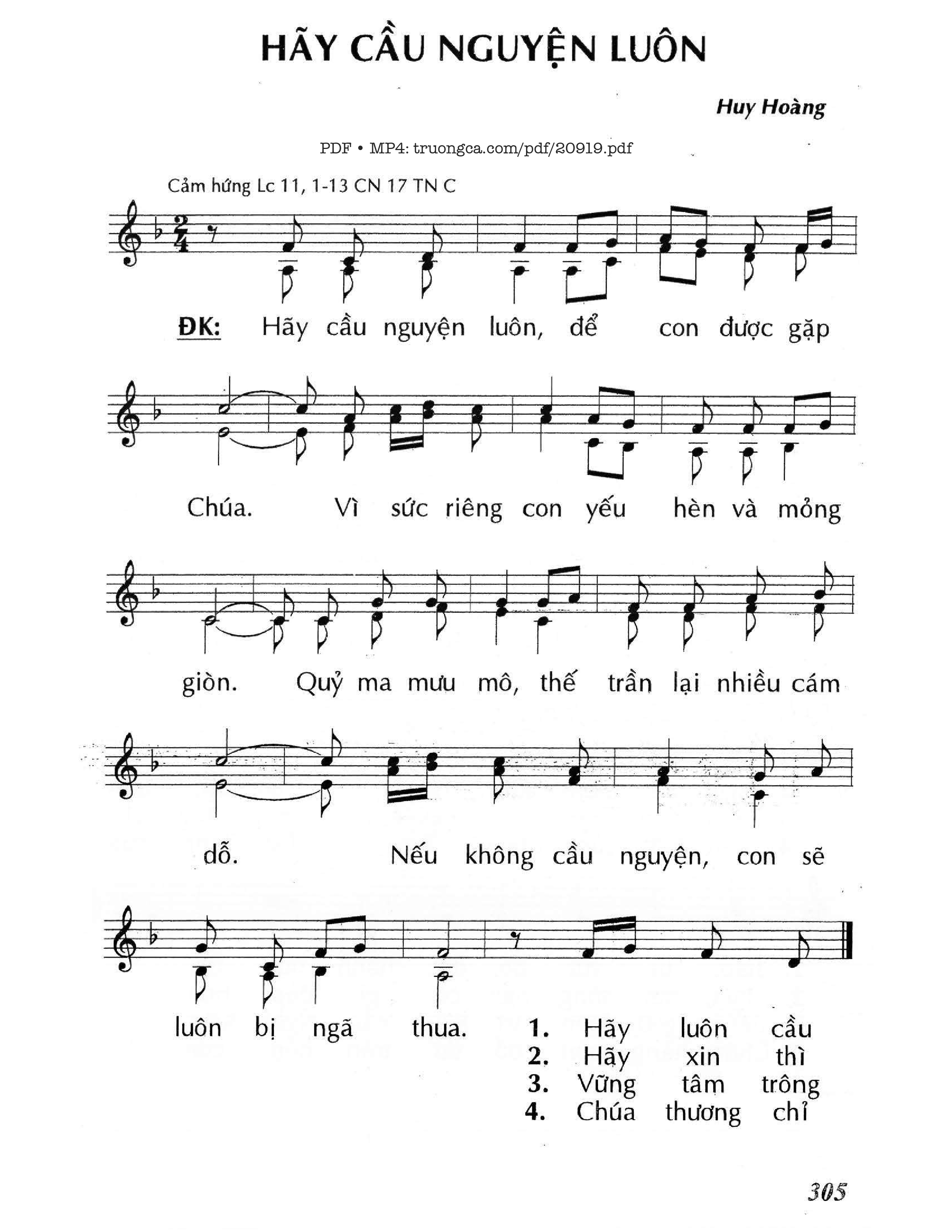 Sheet music Hãy cầu nguyện luôn (Lc. 11) by Huy Hoàng and PDF file was posted here to support you to practice singing perfectly. Sheets with notes and chords are for reference only, for non-commercial purposes only, not involved with earning money by buying and selling. Copyright is belong to song writer/author and copyright owner. Truongca.com do not own any copyrighted content. You can download the high-quality PDF files which contain staffs by PDF link above.
