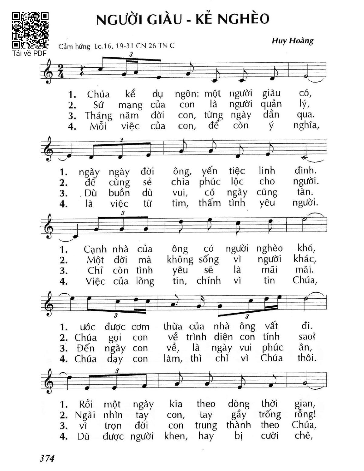 Sheet music Người giàu – Kẻ nghèo (Lc. 16) by Huy Hoàng and PDF file was posted here to support you to practice singing perfectly. Sheets with notes and chords are for reference only, for non-commercial purposes only, not involved with earning money by buying and selling. Copyright is belong to song writer/author and copyright owner. Truongca.com do not own any copyrighted content. You can download the high-quality PDF files which contain staffs by PDF link above.