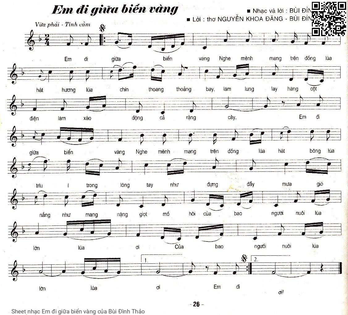 Bùi Đình Thảo Em đi giữa biển vàng Nghe mênh mang trên đồng lúa hát [PDF] [Sheet] [Lyrics] [Mp4/Midi]