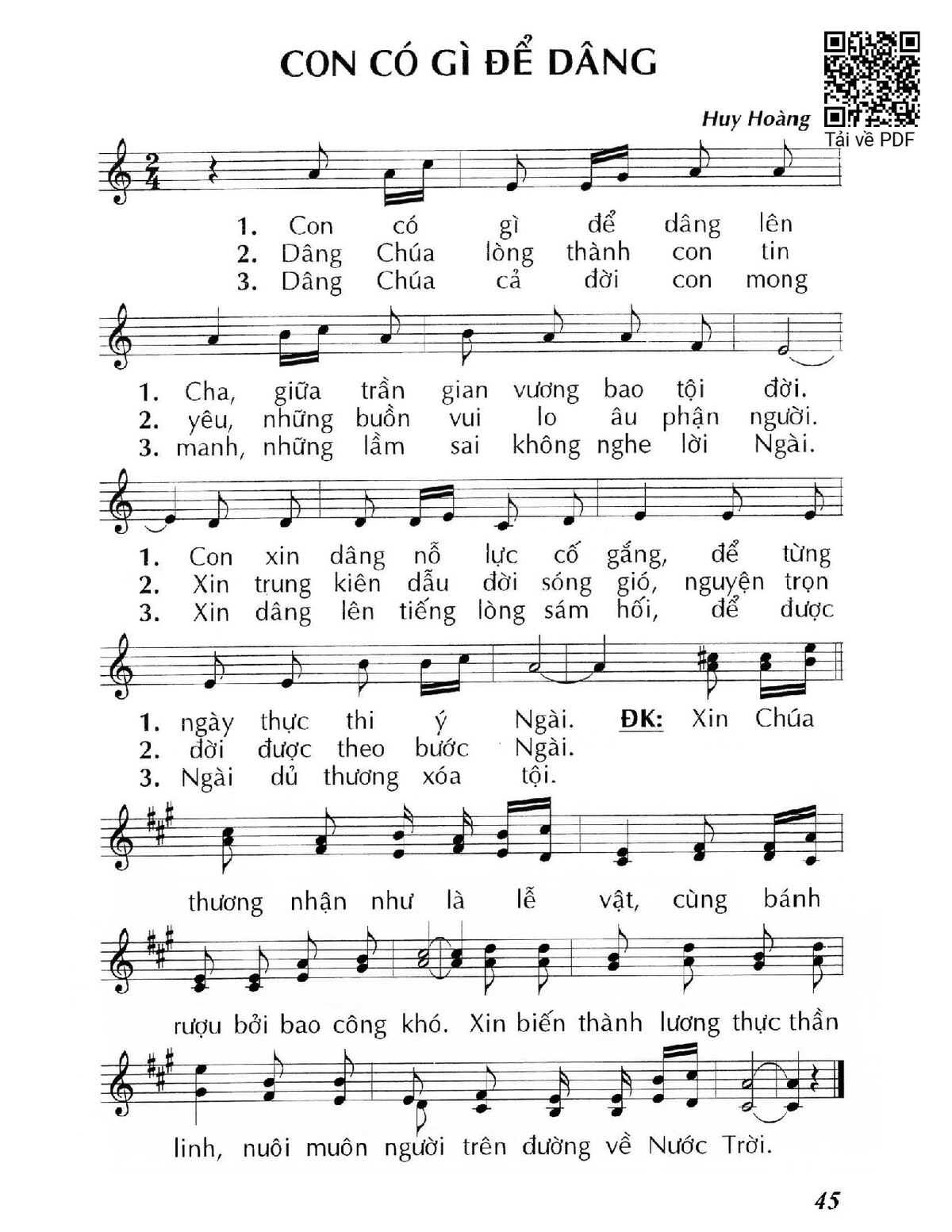 Sheet music Con có gì để dâng by Huy Hoàng and PDF file was posted here to support you to practice singing perfectly. Sheets with notes and chords are for reference only, for non-commercial purposes only, not involved with earning money by buying and selling. Copyright is belong to song writer/author and copyright owner. Truongca.com do not own any copyrighted content. You can download the high-quality PDF files which contain staffs by PDF link above.