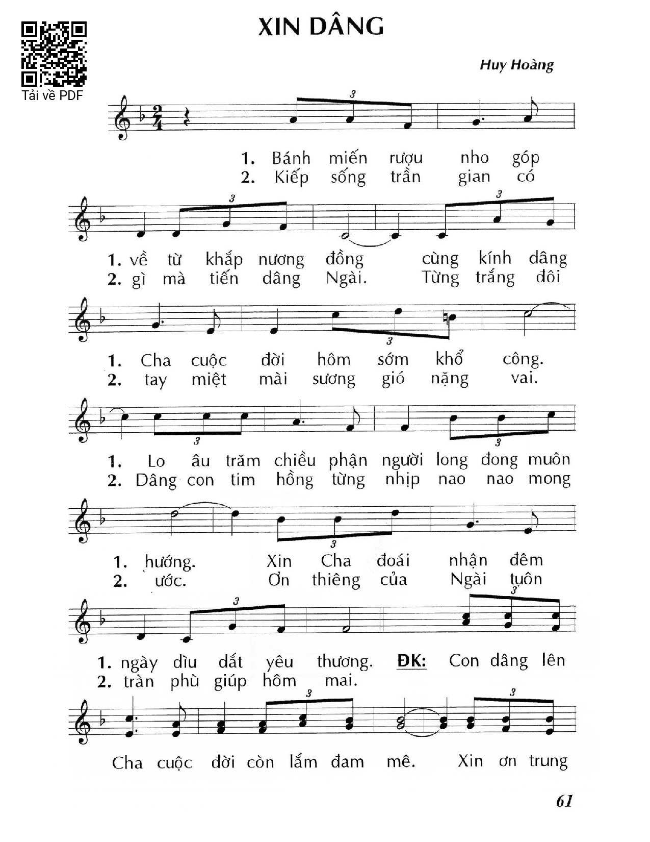 Sheet music Xin dâng by Huy Hoàng and PDF file was posted here to support you to practice singing perfectly. Sheets with notes and chords are for reference only, for non-commercial purposes only, not involved with earning money by buying and selling. Copyright is belong to song writer/author and copyright owner. Truongca.com do not own any copyrighted content. You can download the high-quality PDF files which contain staffs by PDF link above.