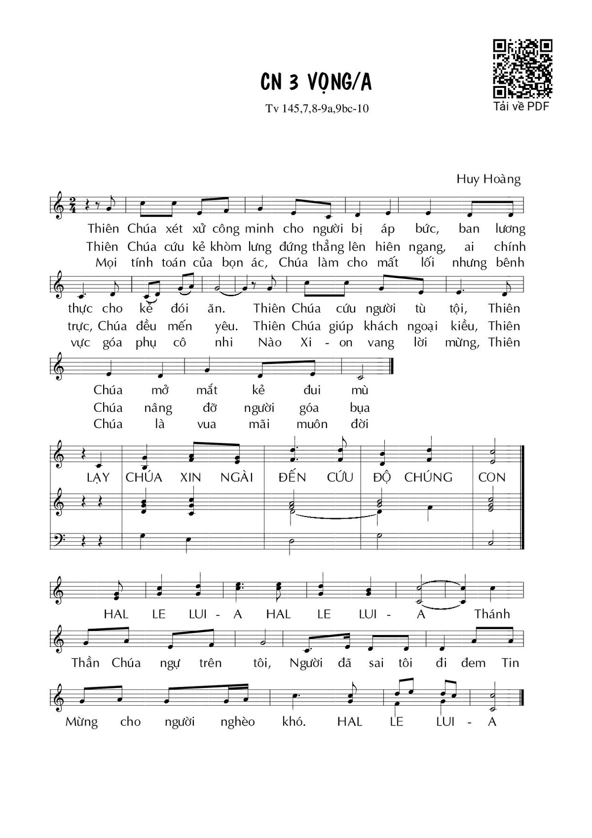Sheet music Chúa nhật 3A Mùa Vọng by Huy Hoàng and PDF file was posted here to support you to practice singing perfectly. Sheets with notes and chords are for reference only, for non-commercial purposes only, not involved with earning money by buying and selling. Copyright is belong to song writer/author and copyright owner. Truongca.com do not own any copyrighted content. You can download the high-quality PDF files which contain staffs by PDF link above.