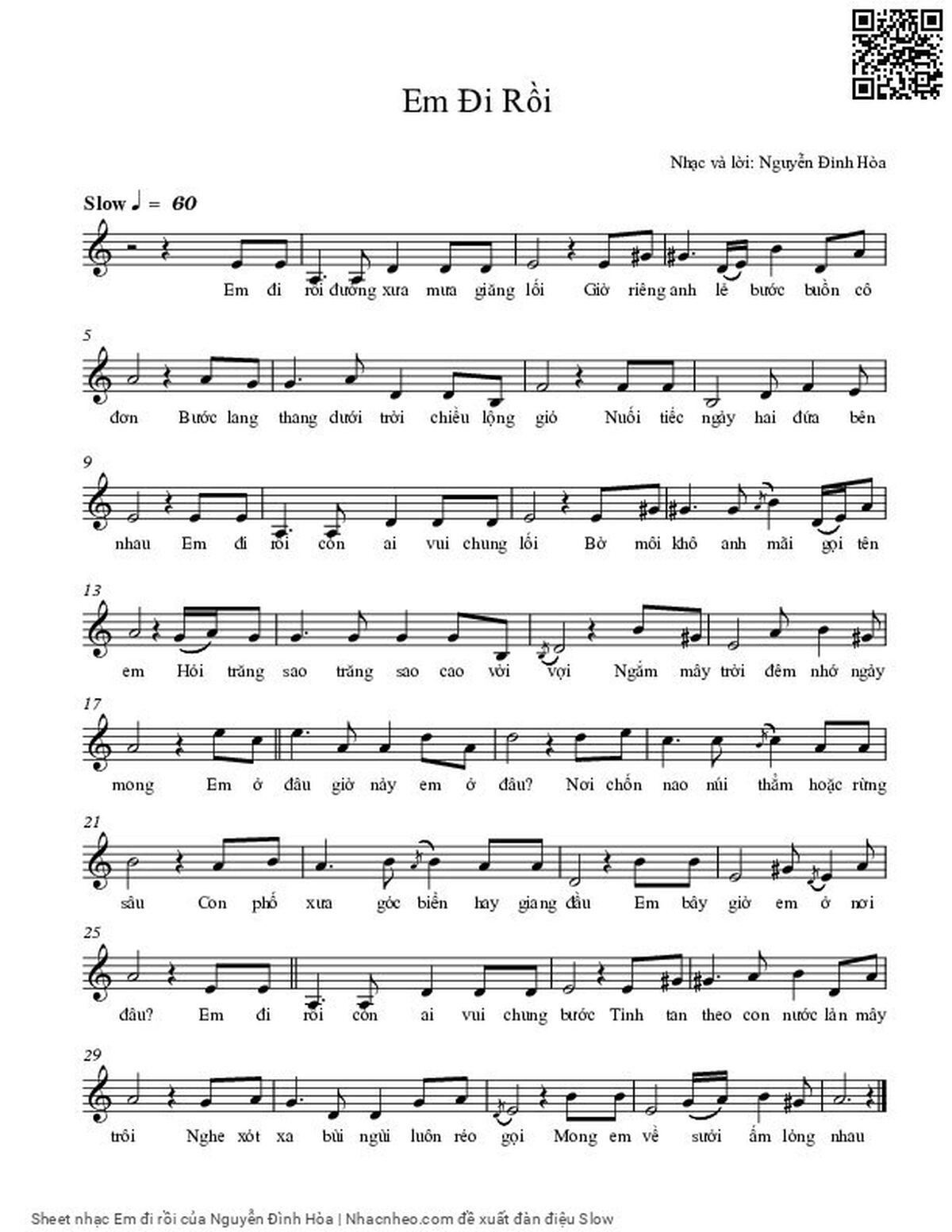 Nguyễn Đình Hòa Em đi rồi đường xưa mưa giăng lối Giờ riêng anh lẻ bước buồn cô đơn [PDF] [Sheet] [Lyrics] [Mp4/Midi]