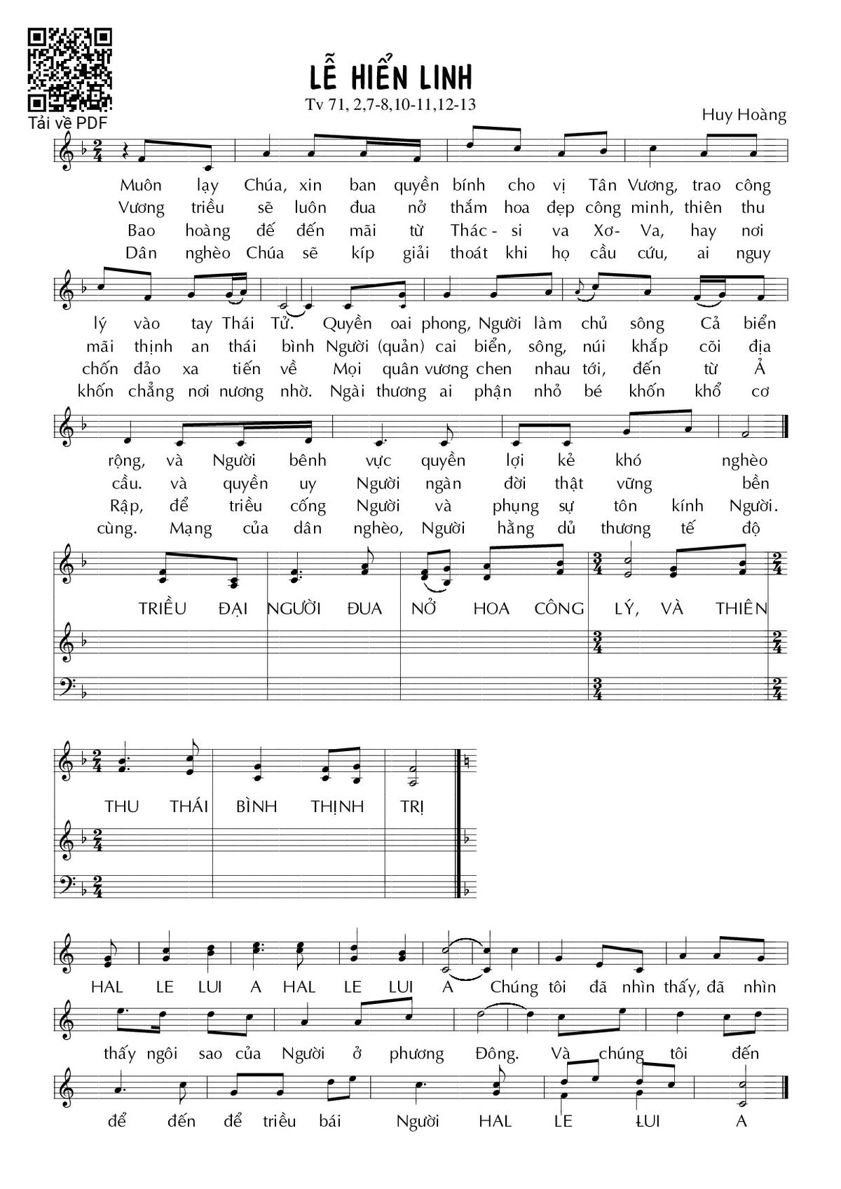 Sheet music Đáp ca lễ Hiển Linh by Huy Hoàng and PDF file was posted here to support you to practice singing perfectly. Sheets with notes and chords are for reference only, for non-commercial purposes only, not involved with earning money by buying and selling. Copyright is belong to song writer/author and copyright owner. Truongca.com do not own any copyrighted content. You can download the high-quality PDF files which contain staffs by PDF link above.