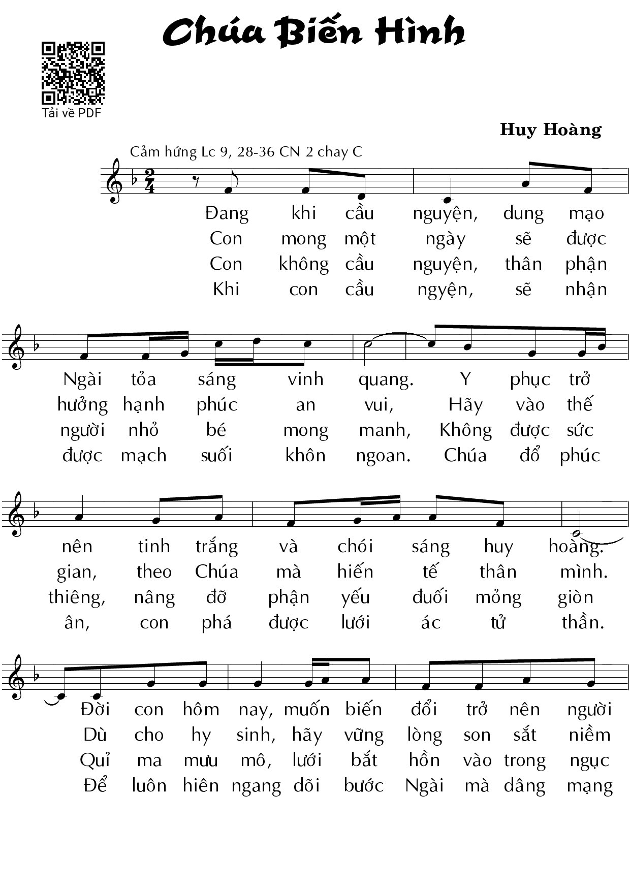 Sheet music Chúa biến hình by Huy Hoàng and PDF file was posted here to support you to practice singing perfectly. Sheets with notes and chords are for reference only, for non-commercial purposes only, not involved with earning money by buying and selling. Copyright is belong to song writer/author and copyright owner. Truongca.com do not own any copyrighted content. You can download the high-quality PDF files which contain staffs by PDF link above.
