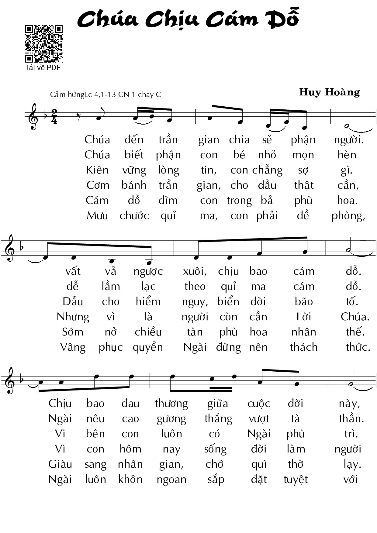 Sheet music Chúa chịu cám dỗ by Huy Hoàng and PDF file was posted here to support you to practice singing perfectly. Sheets with notes and chords are for reference only, for non-commercial purposes only, not involved with earning money by buying and selling. Copyright is belong to song writer/author and copyright owner. Truongca.com do not own any copyrighted content. You can download the high-quality PDF files which contain staffs by PDF link above.