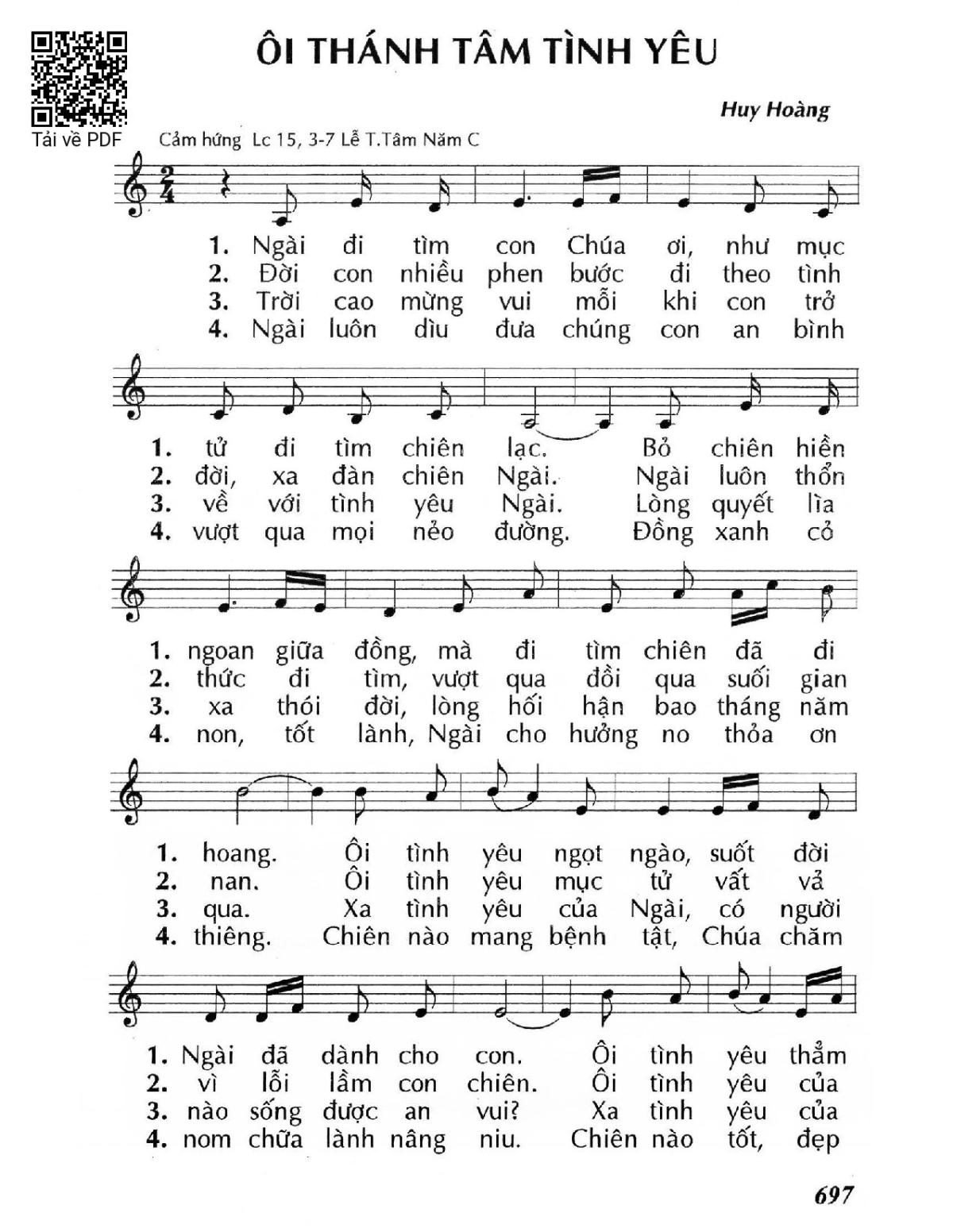Sheet music Ôi Thánh Tâm tình yêu by Huy Hoàng and PDF file was posted here to support you to practice singing perfectly. Sheets with notes and chords are for reference only, for non-commercial purposes only, not involved with earning money by buying and selling. Copyright is belong to song writer/author and copyright owner. Truongca.com do not own any copyrighted content. You can download the high-quality PDF files which contain staffs by PDF link above.