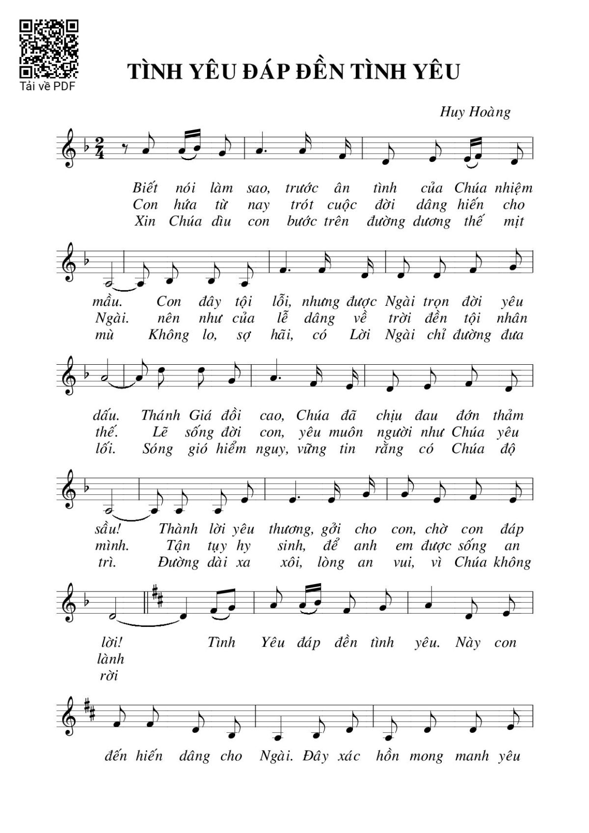 Sheet music Tình yêu đáp đền tình yêu by Huy Hoàng and PDF file was posted here to support you to practice singing perfectly. Sheets with notes and chords are for reference only, for non-commercial purposes only, not involved with earning money by buying and selling. Copyright is belong to song writer/author and copyright owner. Truongca.com do not own any copyrighted content. You can download the high-quality PDF files which contain staffs by PDF link above.