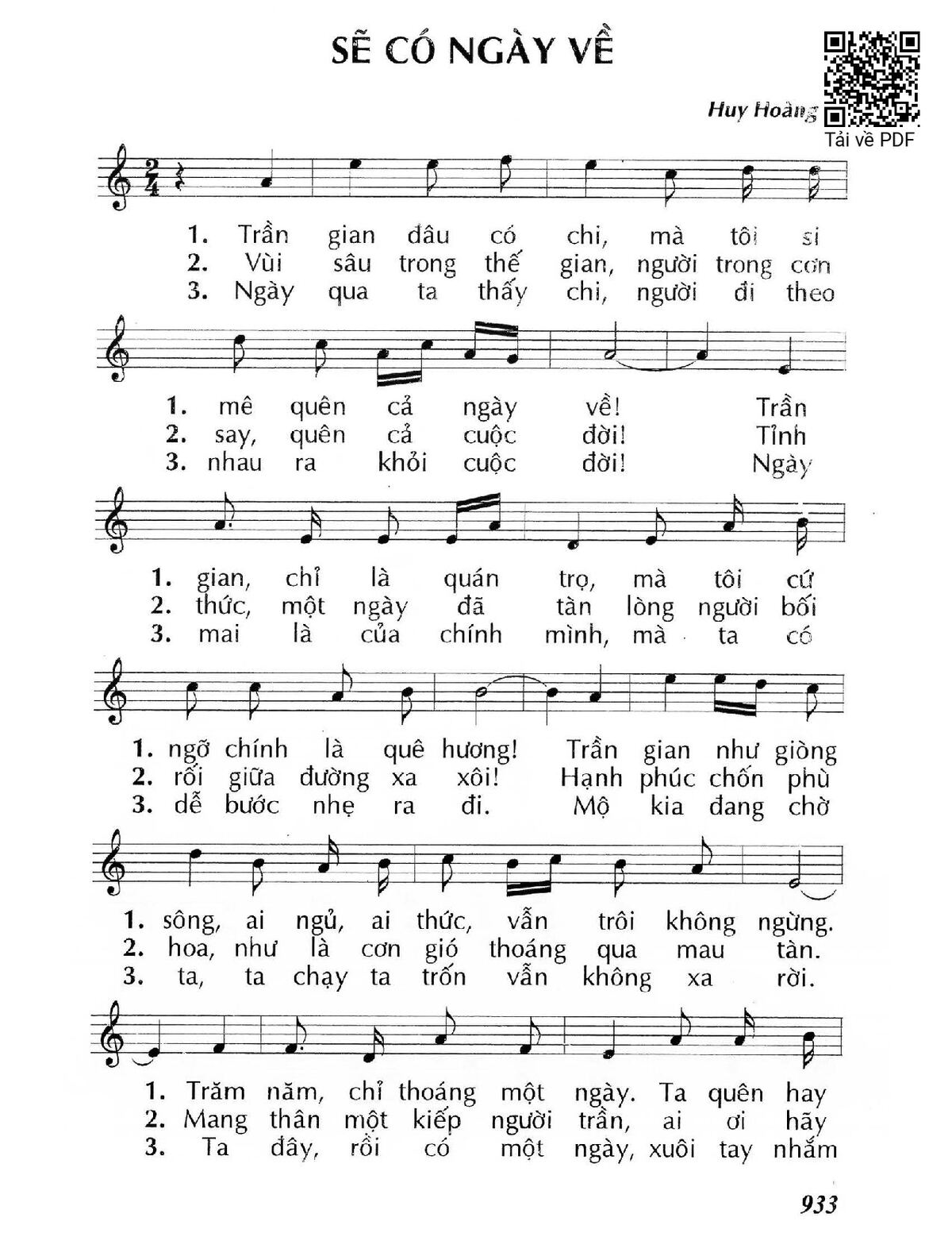 Sheet music Sẽ có ngày về by Huy Hoàng and PDF file was posted here to support you to practice singing perfectly. Sheets with notes and chords are for reference only, for non-commercial purposes only, not involved with earning money by buying and selling. Copyright is belong to song writer/author and copyright owner. Truongca.com do not own any copyrighted content. You can download the high-quality PDF files which contain staffs by PDF link above.