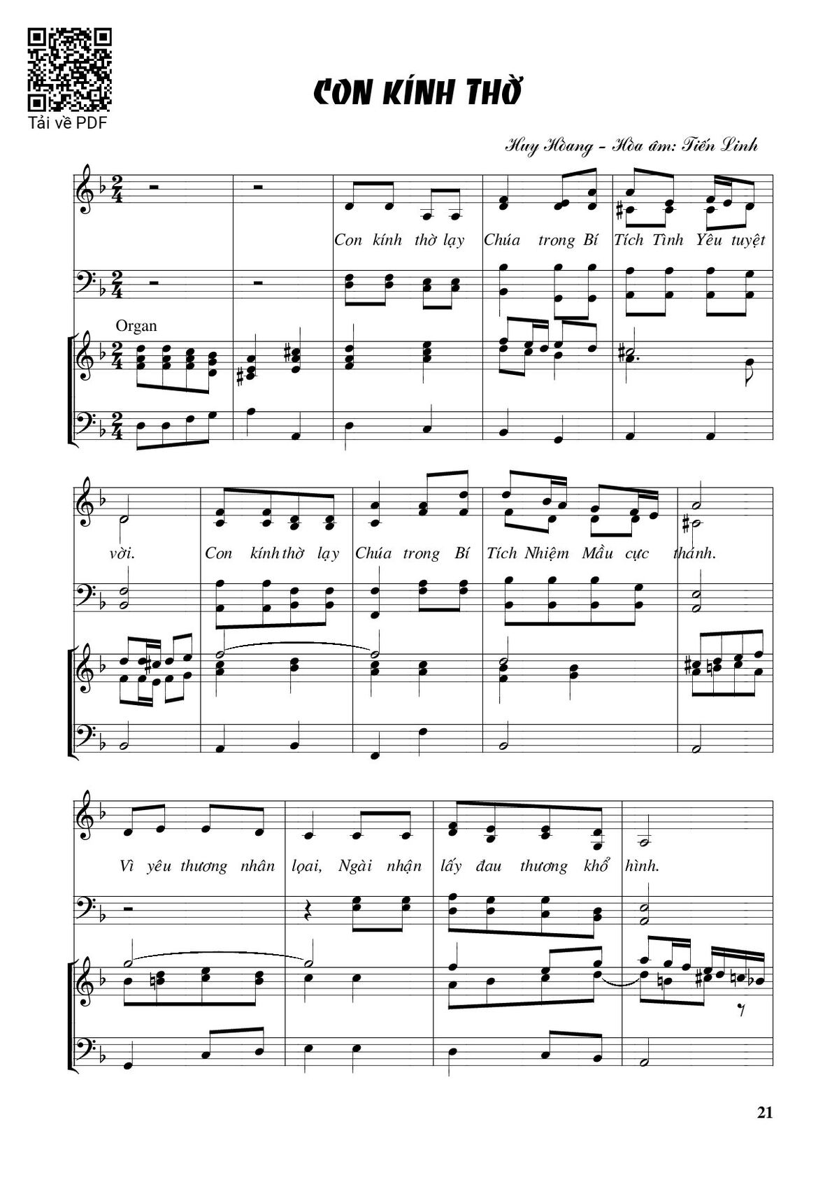 Sheet music Con kính thờ – Huy Hoàng by Huy Hoàng and PDF file was posted here to support you to practice singing perfectly. Sheets with notes and chords are for reference only, for non-commercial purposes only, not involved with earning money by buying and selling. Copyright is belong to song writer/author and copyright owner. Truongca.com do not own any copyrighted content. You can download the high-quality PDF files which contain staffs by PDF link above.