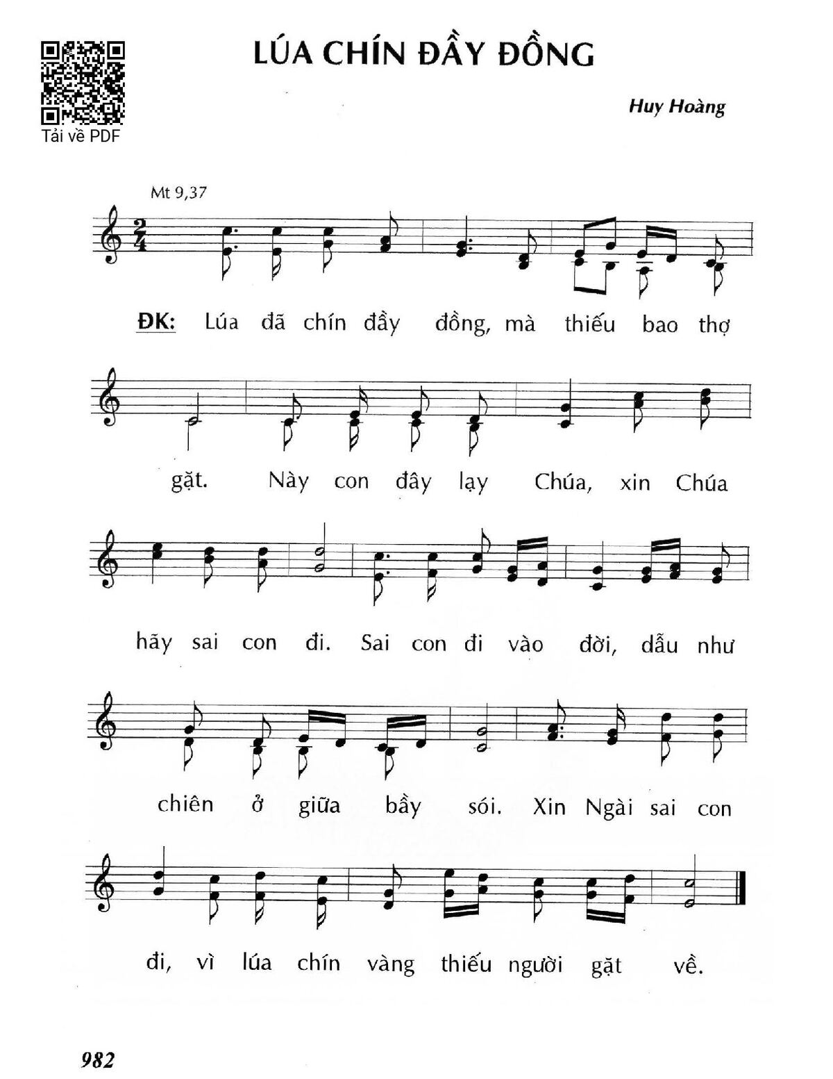 Sheet music Lúa chín đầy đồng (Mt 9,37) by Huy Hoàng and PDF file was posted here to support you to practice singing perfectly. Sheets with notes and chords are for reference only, for non-commercial purposes only, not involved with earning money by buying and selling. Copyright is belong to song writer/author and copyright owner. Truongca.com do not own any copyrighted content. You can download the high-quality PDF files which contain staffs by PDF link above.