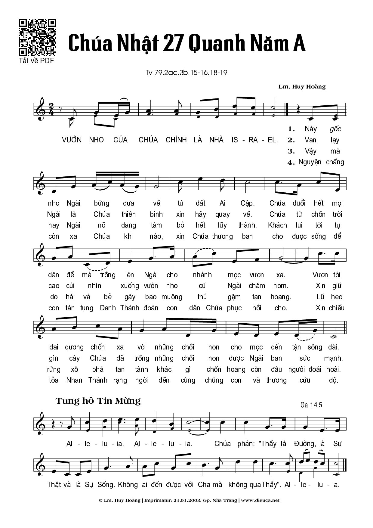 Sheet music Chúa Nhật 27A Thường Niên by Huy Hoàng and PDF file was posted here to support you to practice singing perfectly. Sheets with notes and chords are for reference only, for non-commercial purposes only, not involved with earning money by buying and selling. Copyright is belong to song writer/author and copyright owner. Truongca.com do not own any copyrighted content. You can download the high-quality PDF files which contain staffs by PDF link above.
