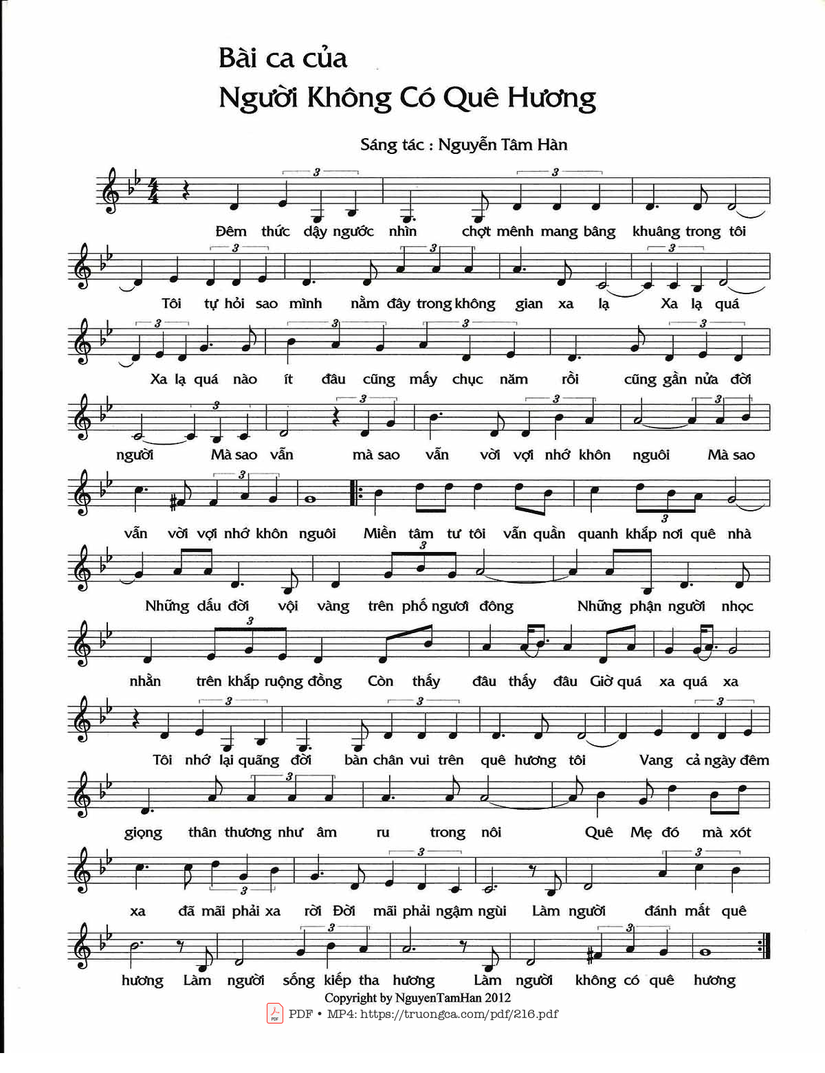 The Videos/audios Bài ca của người không có quê hương by Nguyễn Tâm Hàn were embed from Youtube, Musescore or the other 3rd links. Videos are subject to 3rd's copyright control and may be removed by YouTube's copyright rules and 3rd's policies or maybe included advertisements. If you cannot access to these songs, this mean that have been removed.