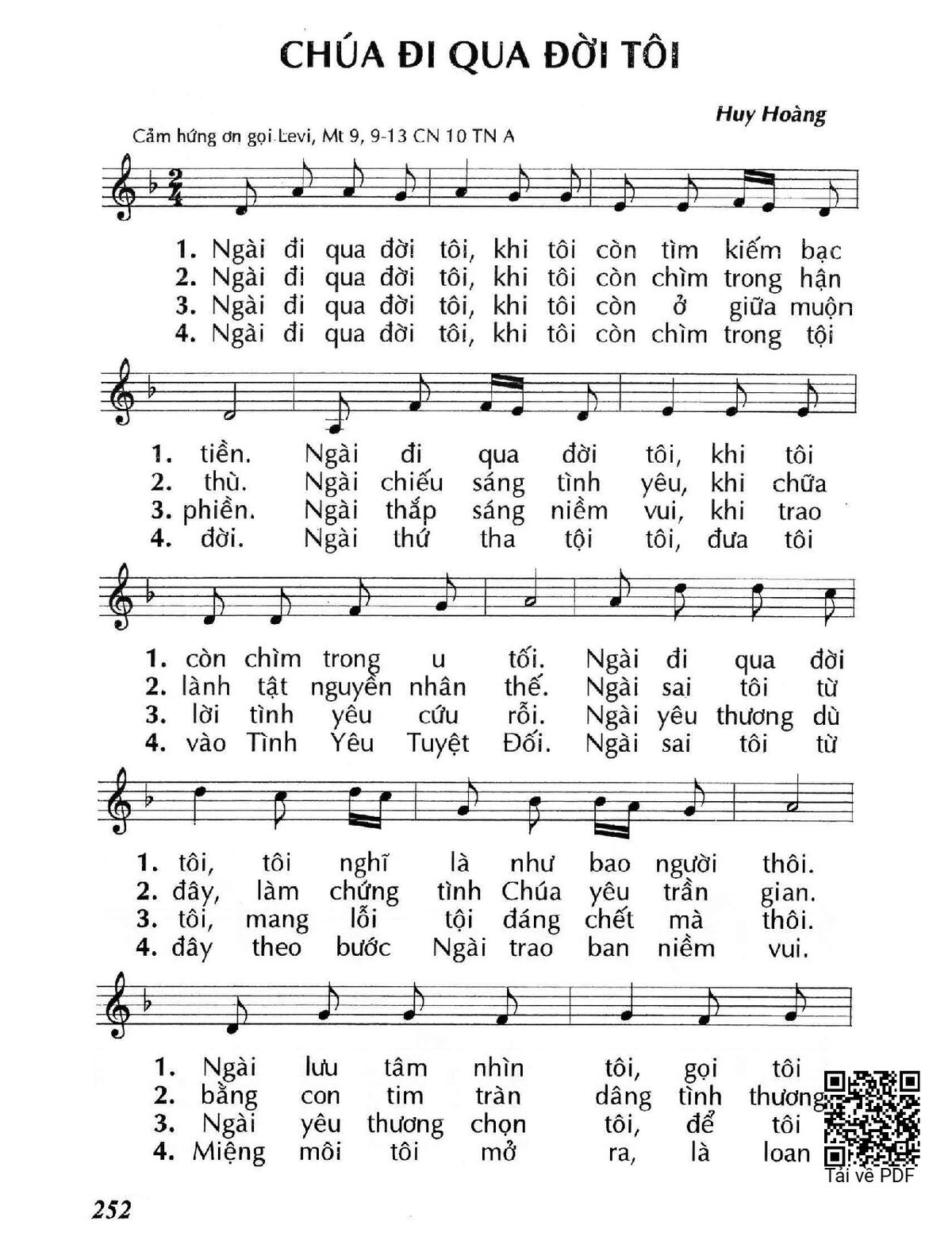Sheet music Chúa đi qua đời tôi (Mt. 9) by Huy Hoàng and PDF file was posted here to support you to practice singing perfectly. Sheets with notes and chords are for reference only, for non-commercial purposes only, not involved with earning money by buying and selling. Copyright is belong to song writer/author and copyright owner. Truongca.com do not own any copyrighted content. You can download the high-quality PDF files which contain staffs by PDF link above.