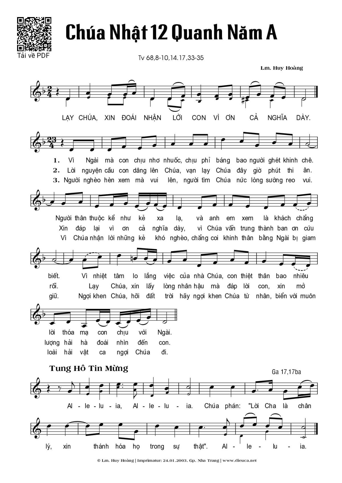 Sheet music Chúa Nhật 12A Thường Niên (Thánh Vịnh 68) by Huy Hoàng and PDF file was posted here to support you to practice singing perfectly. Sheets with notes and chords are for reference only, for non-commercial purposes only, not involved with earning money by buying and selling. Copyright is belong to song writer/author and copyright owner. Truongca.com do not own any copyrighted content. You can download the high-quality PDF files which contain staffs by PDF link above.