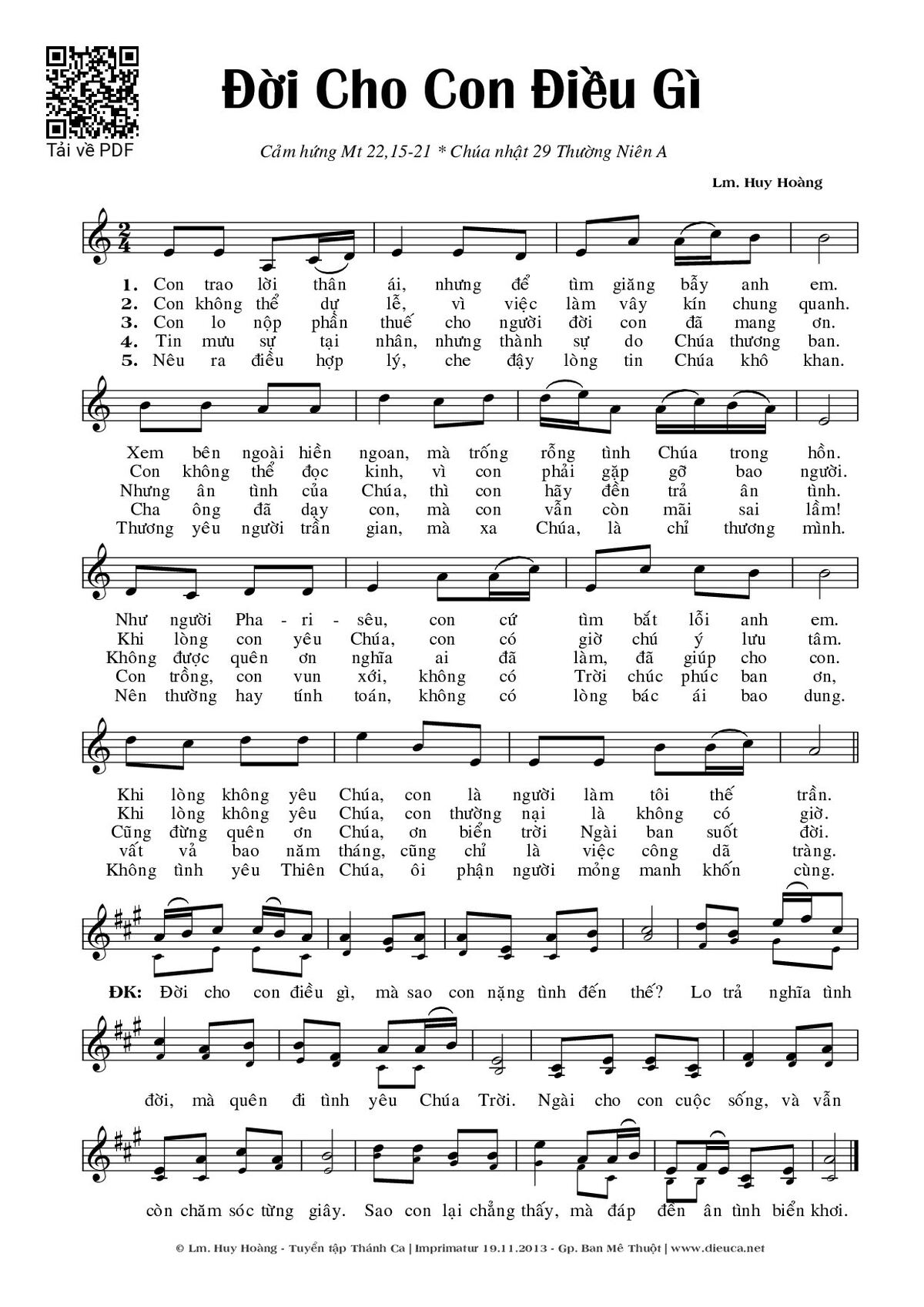 Sheet music Đời Cho Con Điều Gì (Mt. 22) by Huy Hoàng and PDF file was posted here to support you to practice singing perfectly. Sheets with notes and chords are for reference only, for non-commercial purposes only, not involved with earning money by buying and selling. Copyright is belong to song writer/author and copyright owner. Truongca.com do not own any copyrighted content. You can download the high-quality PDF files which contain staffs by PDF link above.
