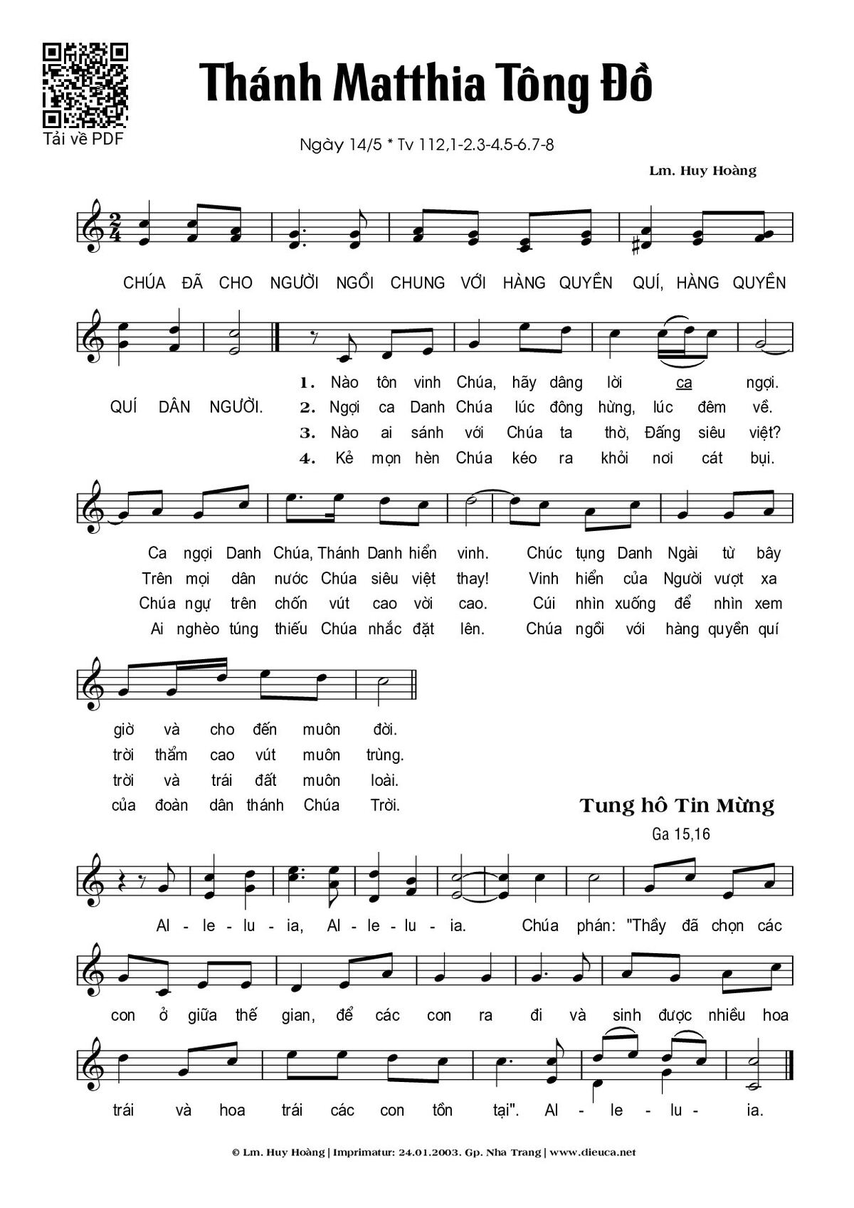 Sheet music Thánh Matthia (14.05) by Huy Hoàng and PDF file was posted here to support you to practice singing perfectly. Sheets with notes and chords are for reference only, for non-commercial purposes only, not involved with earning money by buying and selling. Copyright is belong to song writer/author and copyright owner. Truongca.com do not own any copyrighted content. You can download the high-quality PDF files which contain staffs by PDF link above.