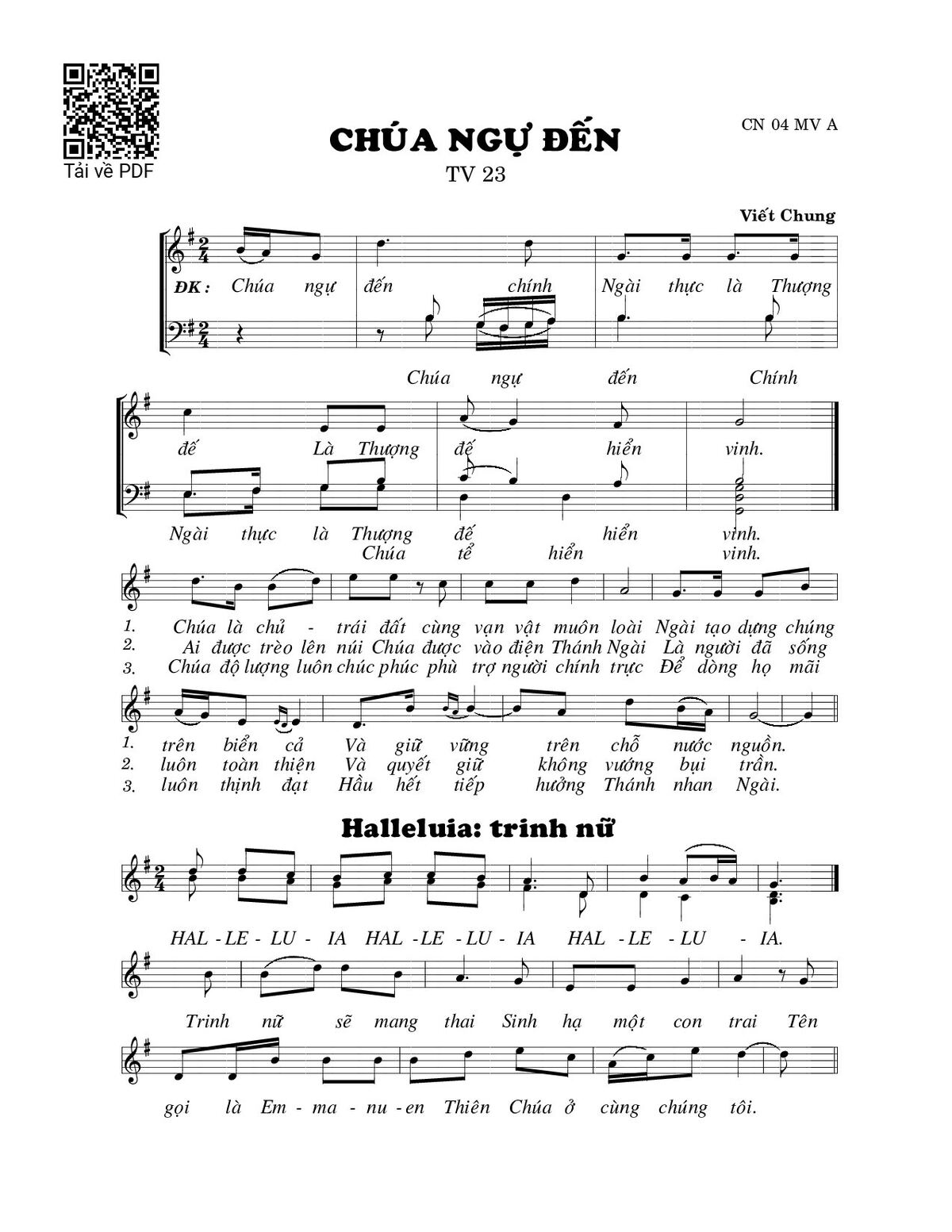 Sheet music Chúa ngự đến (Thánh Vịnh 23) by Viết Chung and PDF file was posted here to support you to practice singing perfectly. Sheets with notes and chords are for reference only, for non-commercial purposes only, not involved with earning money by buying and selling. Copyright is belong to song writer/author and copyright owner. Truongca.com do not own any copyrighted content. You can download the high-quality PDF files which contain staffs by PDF link above.