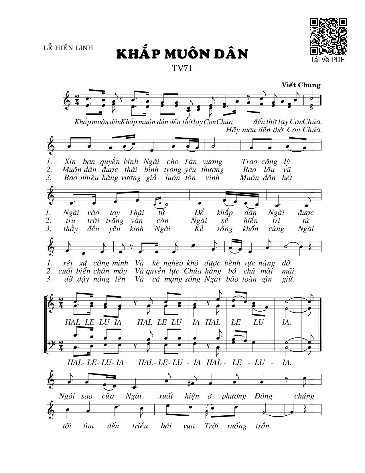 Sheet music Khắp muôn dân 2 (Thánh Vịnh 71) by Viết Chung and PDF file was posted here to support you to practice singing perfectly. Sheets with notes and chords are for reference only, for non-commercial purposes only, not involved with earning money by buying and selling. Copyright is belong to song writer/author and copyright owner. Truongca.com do not own any copyrighted content. You can download the high-quality PDF files which contain staffs by PDF link above.