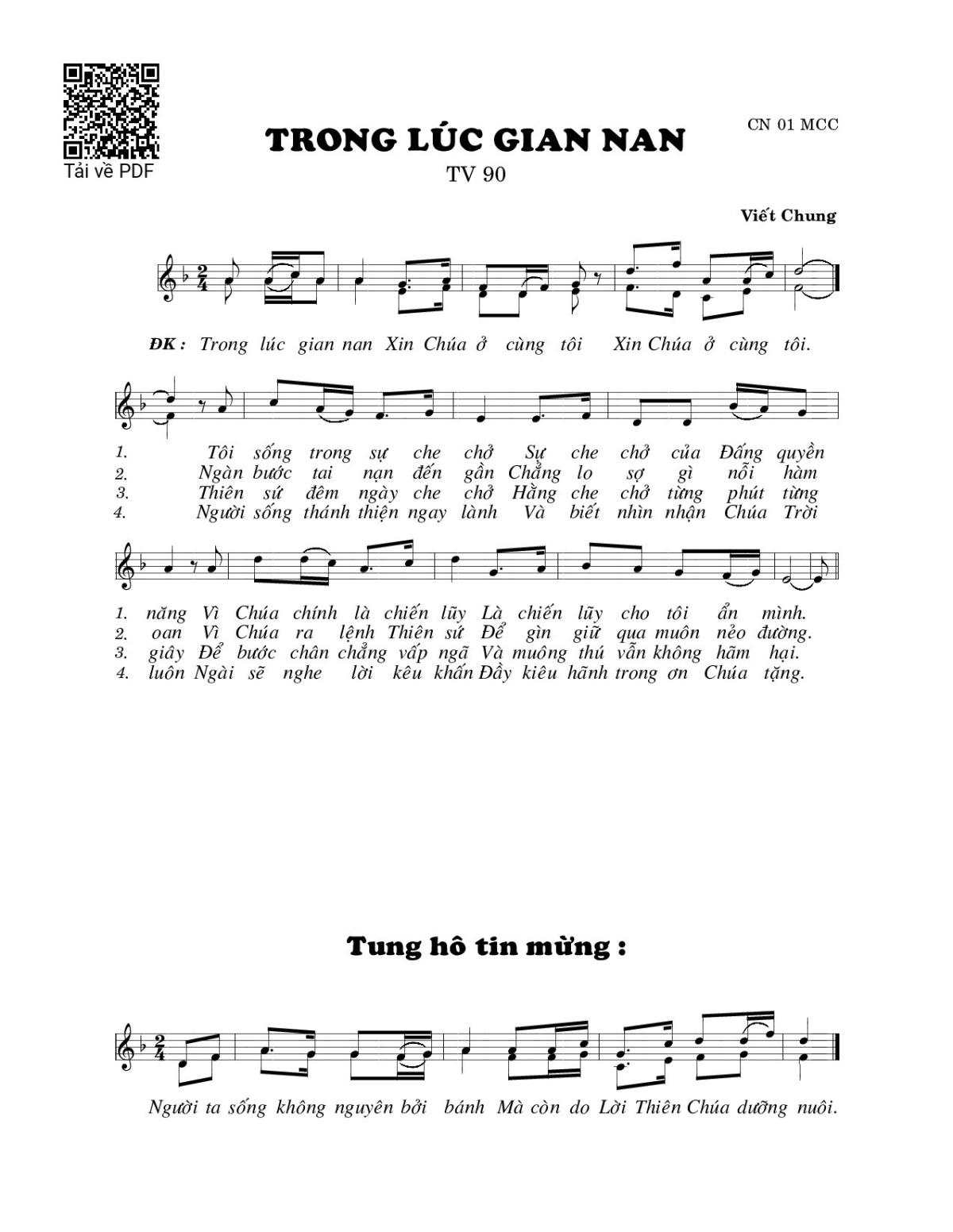 Sheet music Trong lúc gian nan (Thánh Vịnh 90) by Viết Chung and PDF file was posted here to support you to practice singing perfectly. Sheets with notes and chords are for reference only, for non-commercial purposes only, not involved with earning money by buying and selling. Copyright is belong to song writer/author and copyright owner. Truongca.com do not own any copyrighted content. You can download the high-quality PDF files which contain staffs by PDF link above.