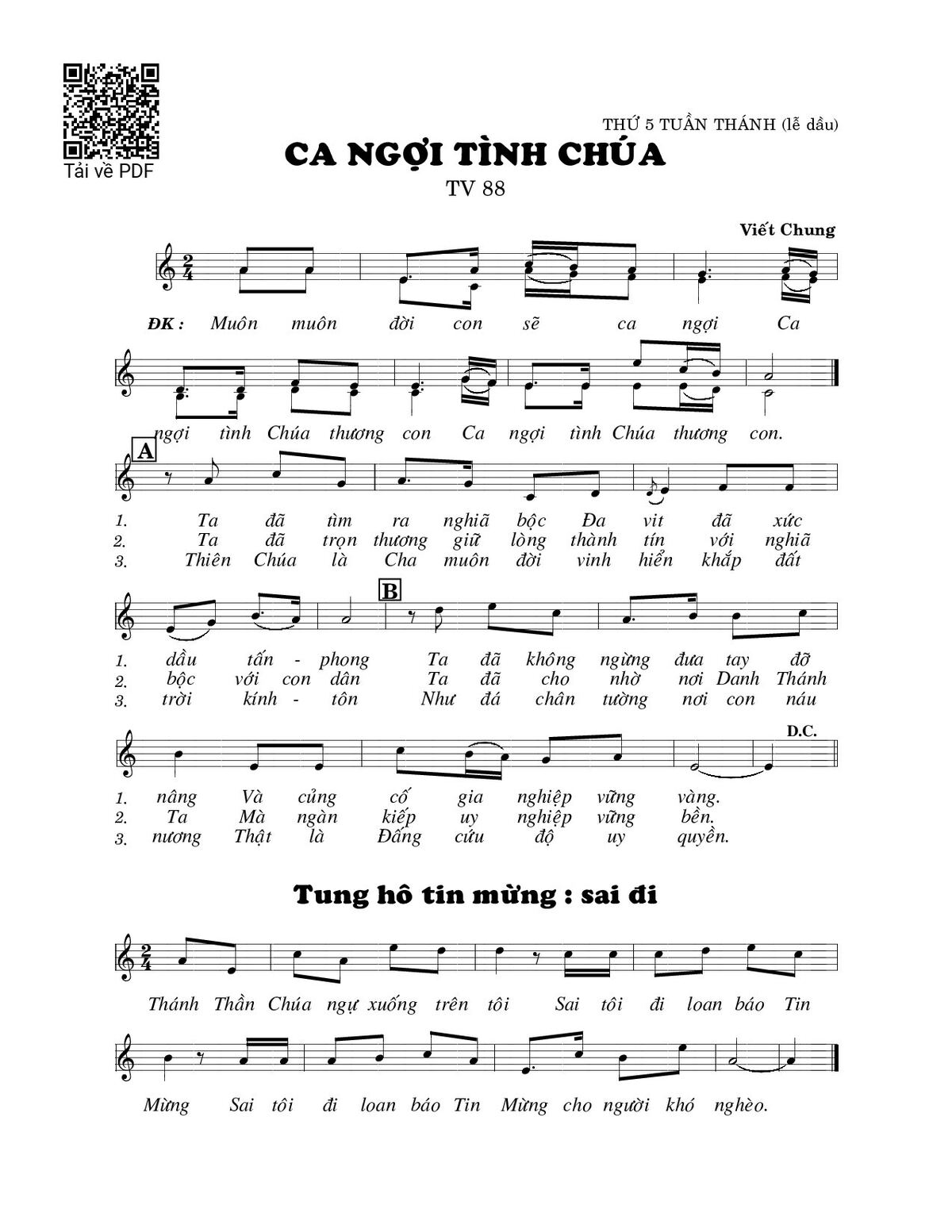Sheet music Ca ngợi tình Chúa (Thánh Vịnh 88) by Viết Chung and PDF file was posted here to support you to practice singing perfectly. Sheets with notes and chords are for reference only, for non-commercial purposes only, not involved with earning money by buying and selling. Copyright is belong to song writer/author and copyright owner. Truongca.com do not own any copyrighted content. You can download the high-quality PDF files which contain staffs by PDF link above.