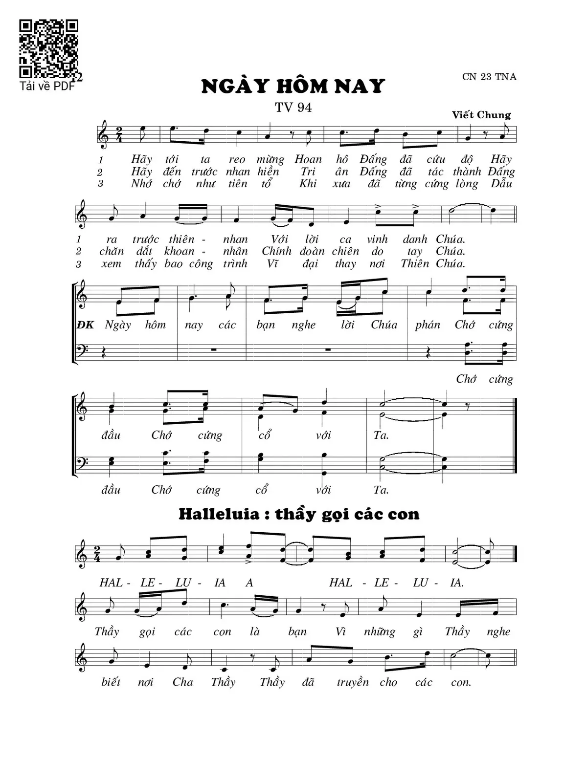Sheet music Ngày hôm nay (Thánh Vịnh 94) by Viết Chung and PDF file was posted here to support you to practice singing perfectly. Sheets with notes and chords are for reference only, for non-commercial purposes only, not involved with earning money by buying and selling. Copyright is belong to song writer/author and copyright owner. Truongca.com do not own any copyrighted content. You can download the high-quality PDF files which contain staffs by PDF link above.