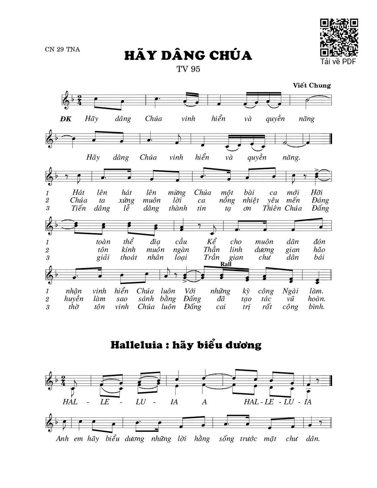 Sheet music Hãy dâng Chúa (Thánh Vịnh 95) by Viết Chung and PDF file was posted here to support you to practice singing perfectly. Sheets with notes and chords are for reference only, for non-commercial purposes only, not involved with earning money by buying and selling. Copyright is belong to song writer/author and copyright owner. Truongca.com do not own any copyrighted content. You can download the high-quality PDF files which contain staffs by PDF link above.